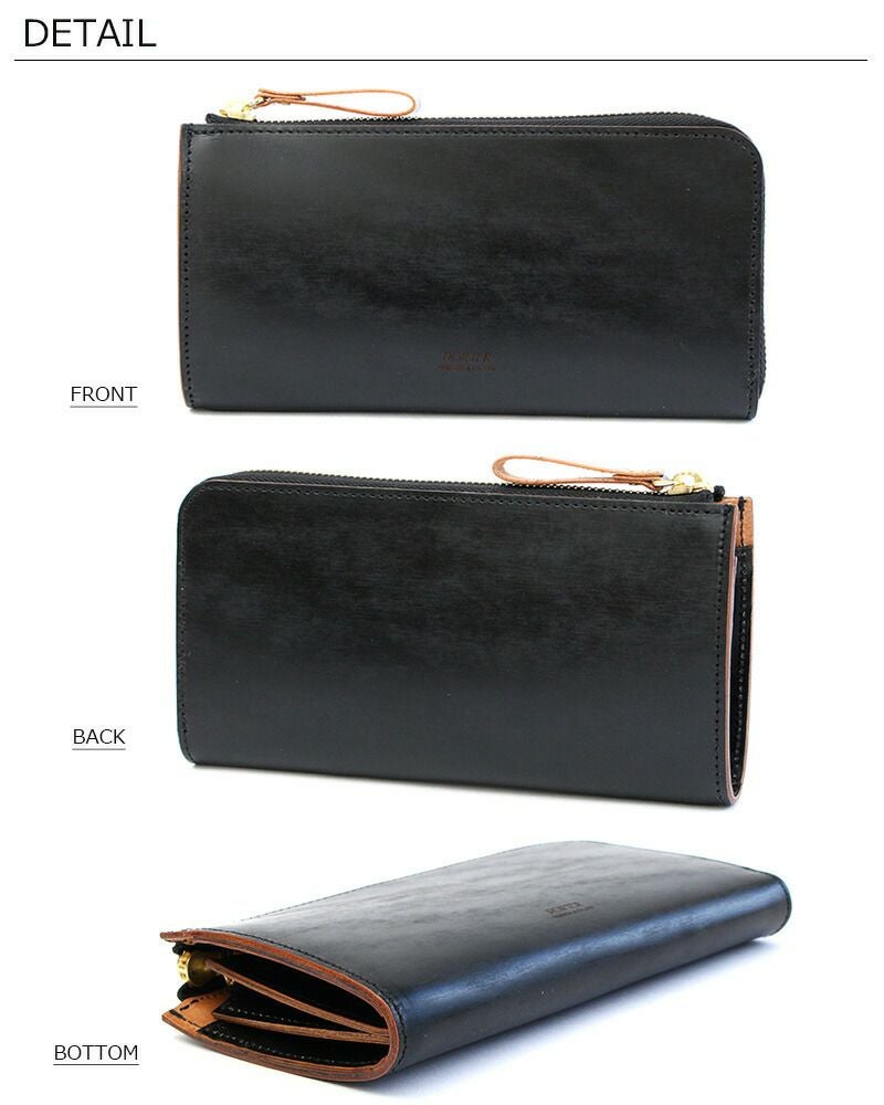 高級感があり、滑らかな開閉と光沢が特徴のゴールドメッキのエクセラファスナーを使用し、コインケースなどの小さなアイテムにもあえて太番手のファスナーを使用することでシリーズのデザインポイントにしています。表面のガラス加工のブラックとヌメ革のコントラストを楽しめるように、外装は切り目磨きでコバ部分を丁寧に磨いてからトップコートで仕上げており、内装も裏地を使わずに革のみで贅沢に仕立てています。