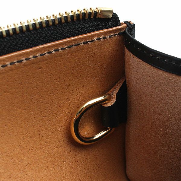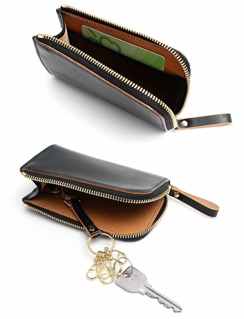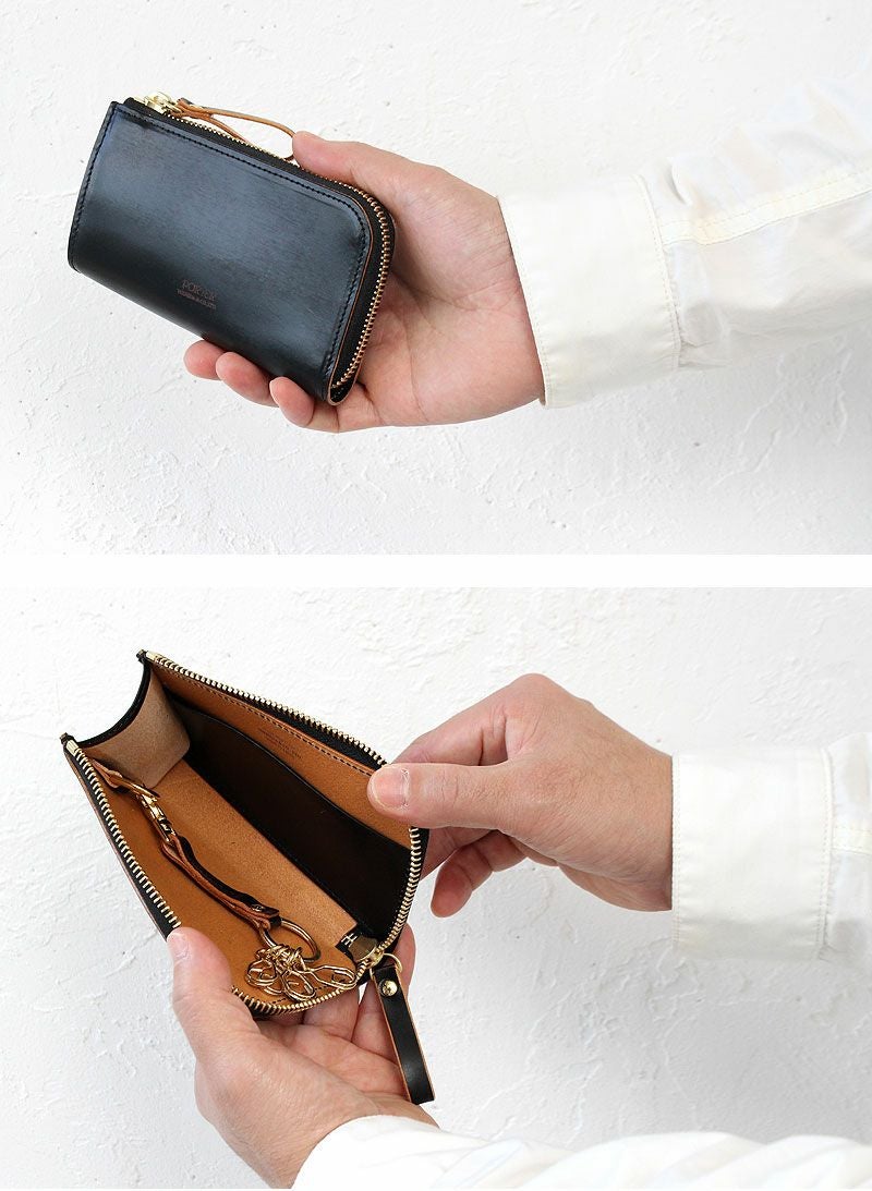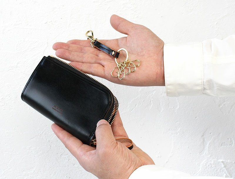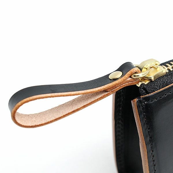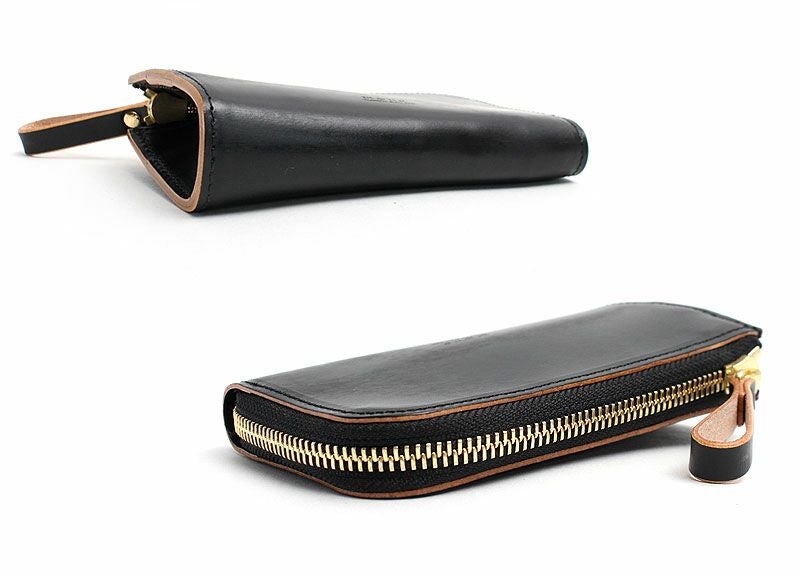 目の詰まったコシのある風合いが特徴の革は、植物タンニンのみを使った鞣し方法を長年守り続けている、イタリア・トスカーナ地方のタンナーでじっくりと丹念に鞣されたヌメ革を使用しています。ショルダー革にはトラと呼ばれる背骨に沿った特徴的な凹凸があり、ガラス加工をした後にヤスリで削る際、その凹凸によって擦れ方に差異が出るため仕上がりが不均一となり、1枚1枚表情が異なるのが魅力です。また、オイルをしっかりと含んでいるため、使うほどに徐々に柔らかく手になじんだ風合いになってきます。高級感があり、滑らかな開閉と光沢が特徴のゴールドメッキのエクセラファスナーを使用し、コインケースなどの小さなアイテムにもあえて太番手のファスナーを使用することでシリーズのデザインポイントにしています。表面のガラス加工のブラックとヌメ革のコントラストを楽しめるように、外装は切り目磨きでコバ部分を丁寧に磨いてからトップコートで仕上げており、内装も裏地を使わずに革のみで贅沢に仕立てています。