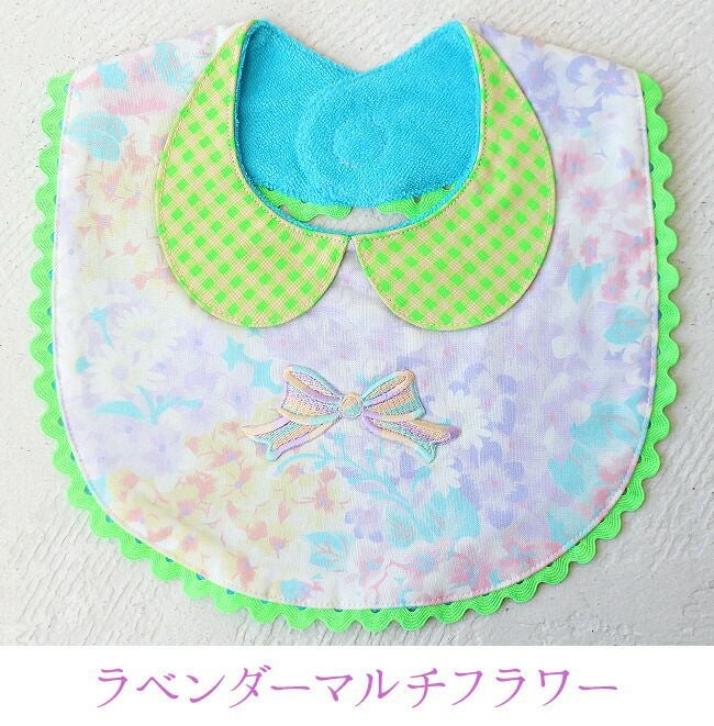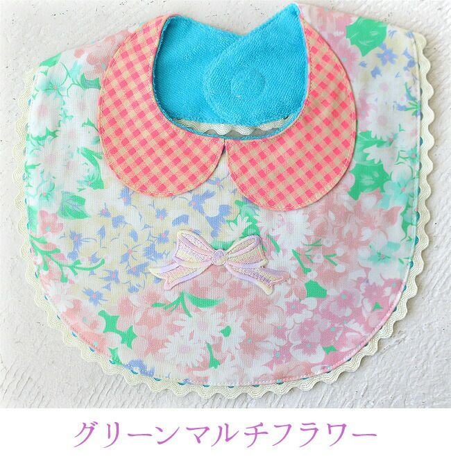 丸い襟にリボンのアップリケがアクセントのちょっぴり贅沢なお洋服ビブです。