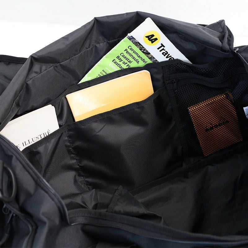 サイドにはファスナーポケット、反対側にはシューズボックスが備わっています。