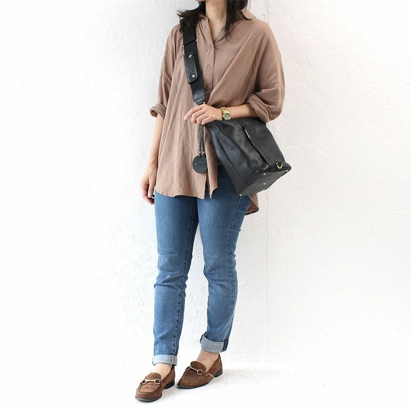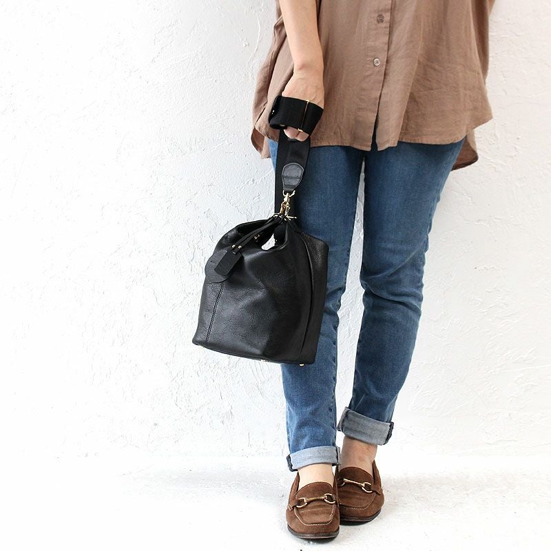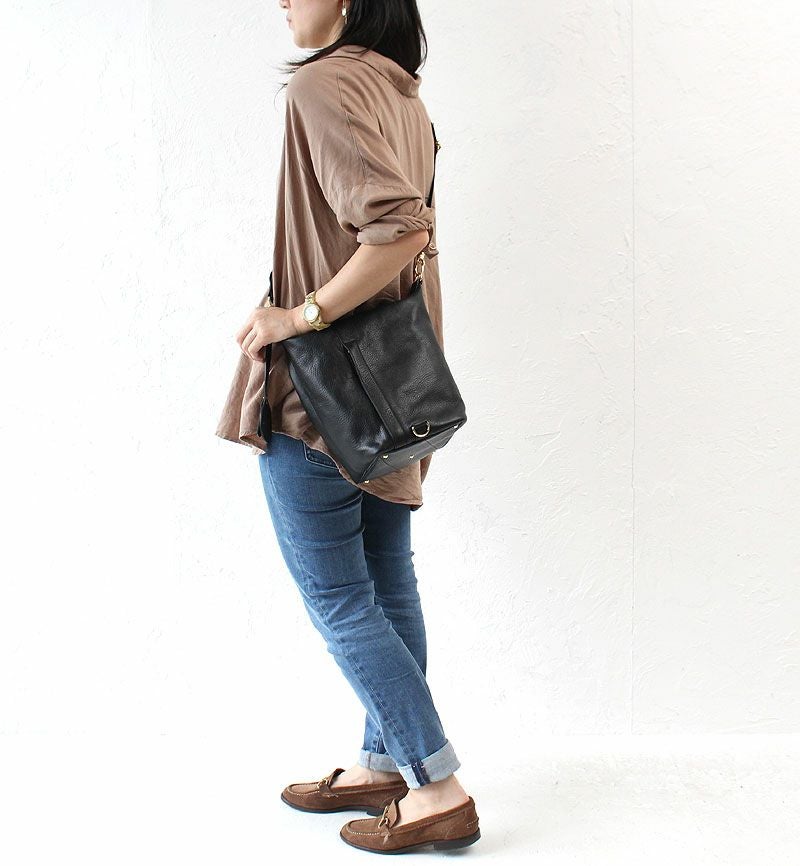 またショルダーストラップのナスカンなどの金具使いやカバンの底部分に施したステッチワークなど、 シンプルなデザインながらも、存在感のある佇まいも魅力的です。