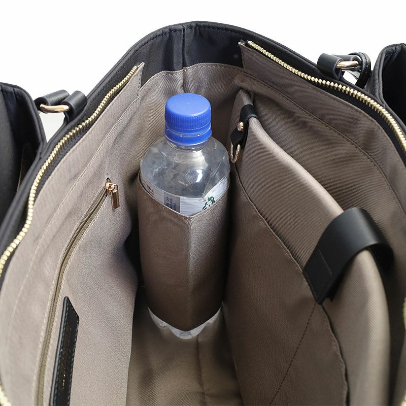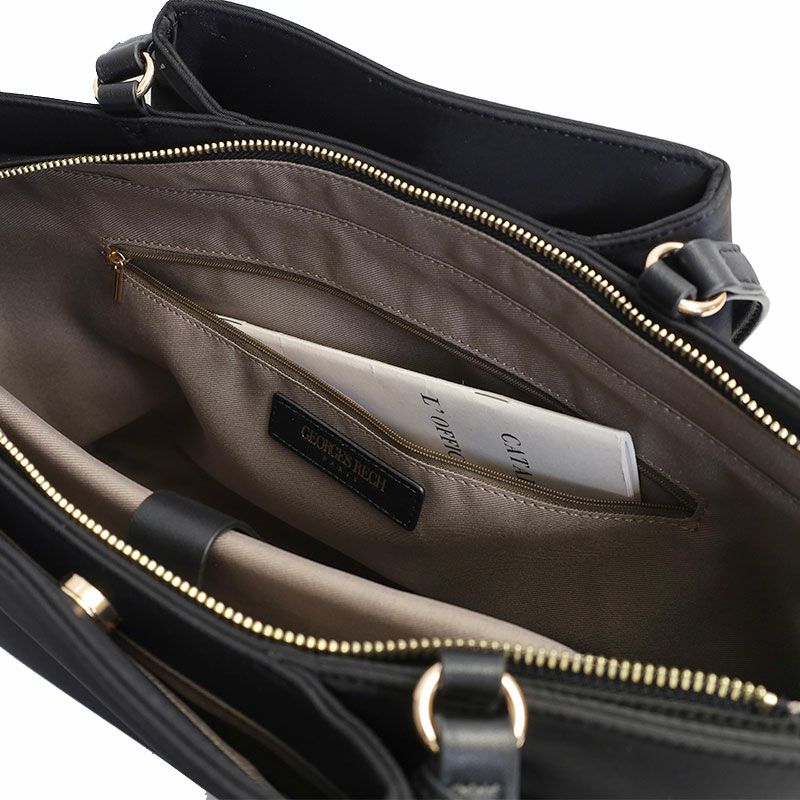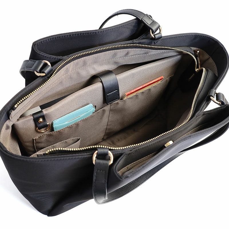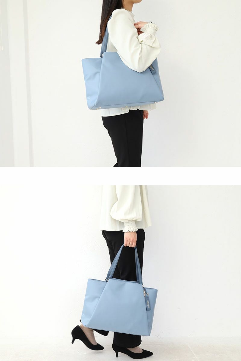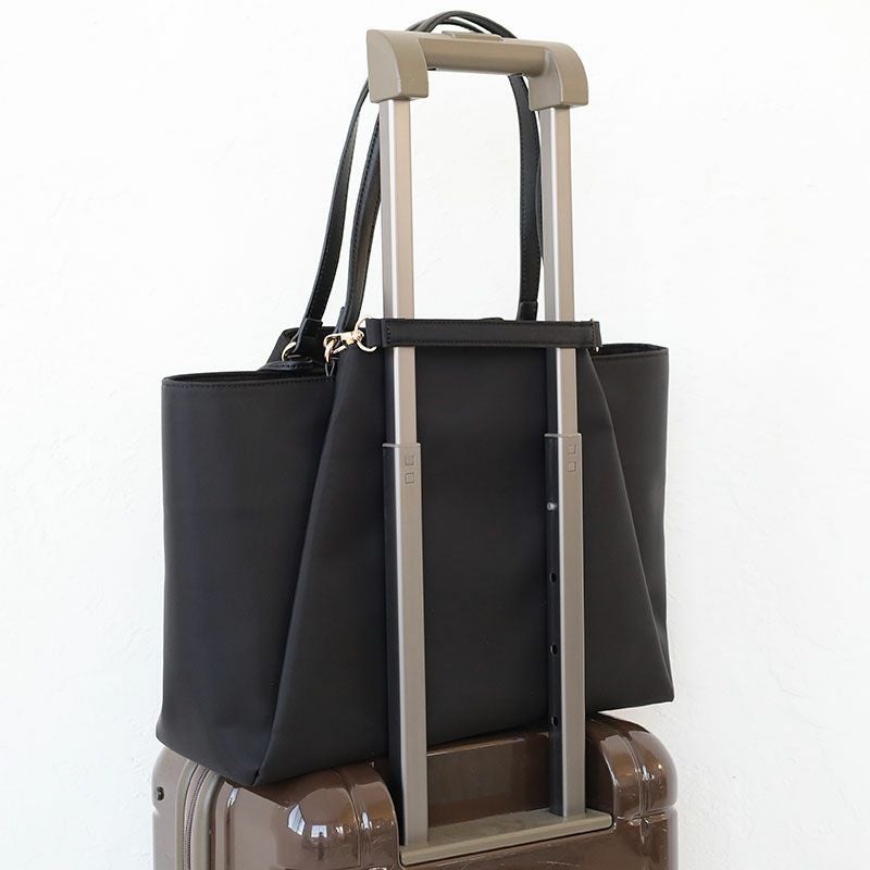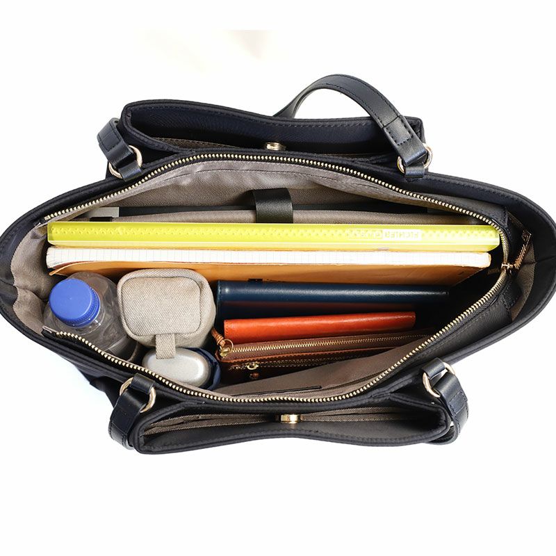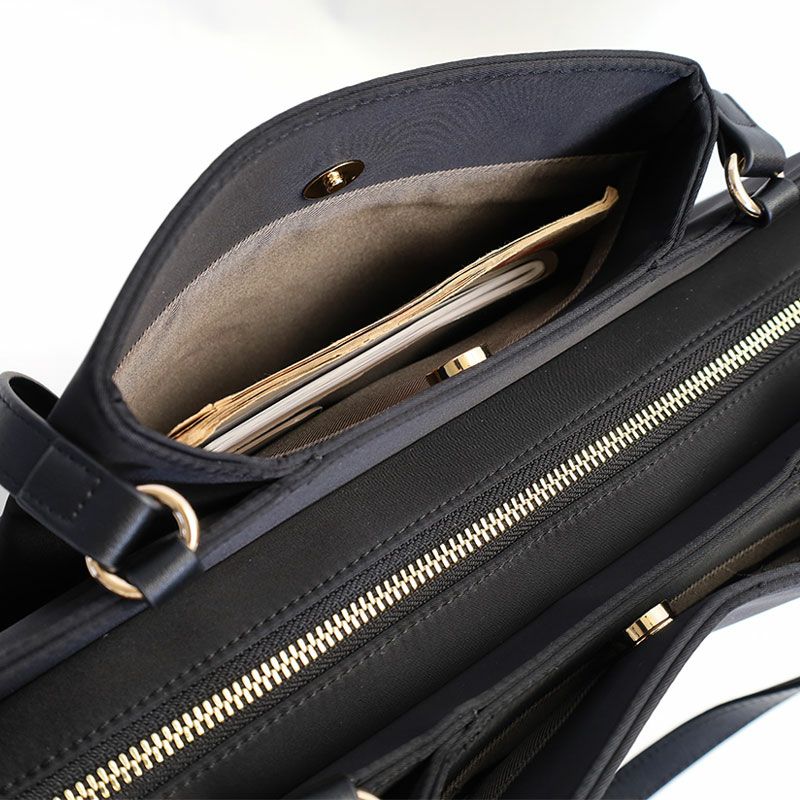 張り感のある上質なフォルムに、PCポケット、キャリーハンドル通しベルトなど、デザイン性と機能性を充実させたON?OFFシームレスな女性向けバッグ。