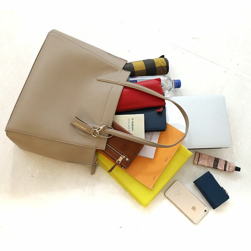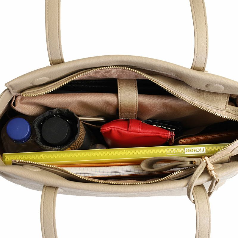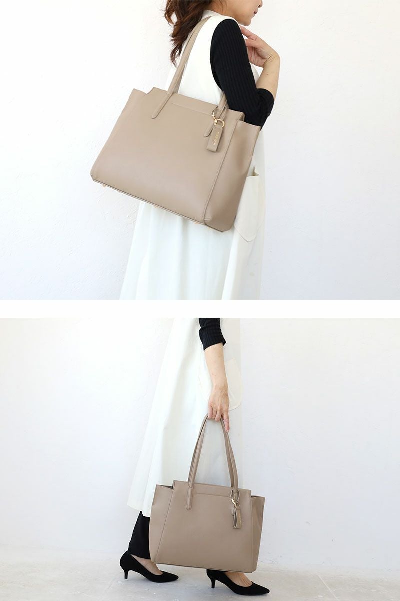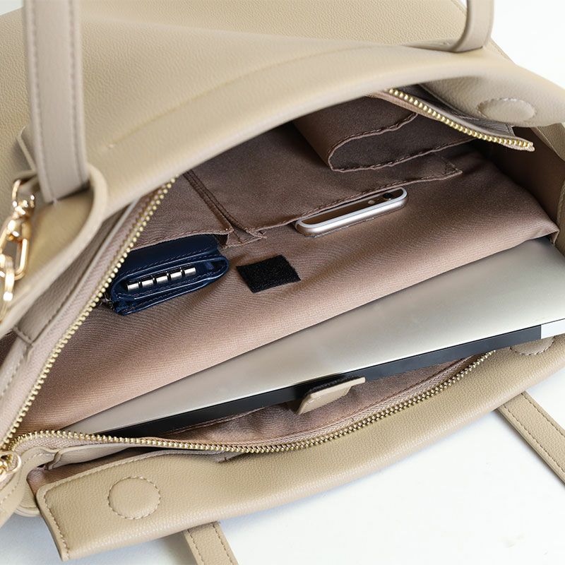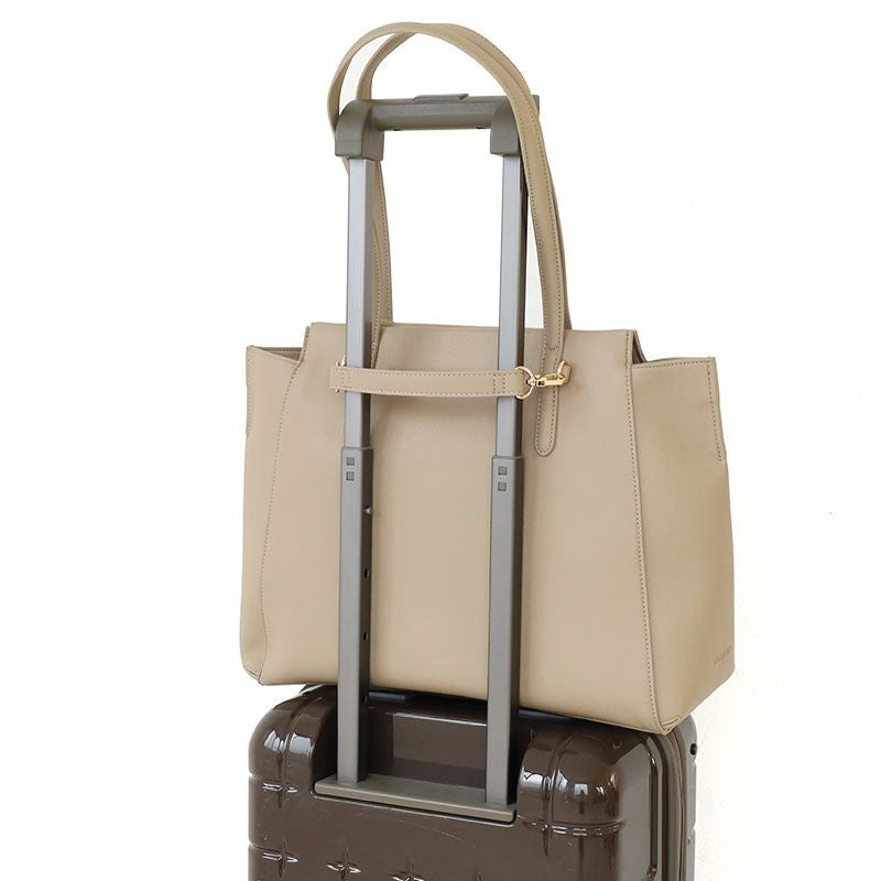 落ち着いた風合いと、PCポケット、キャリーハンドル通しベルトなどデザイン性と機能性を充実させたON/OFFシームレスな女性向けバッグ。