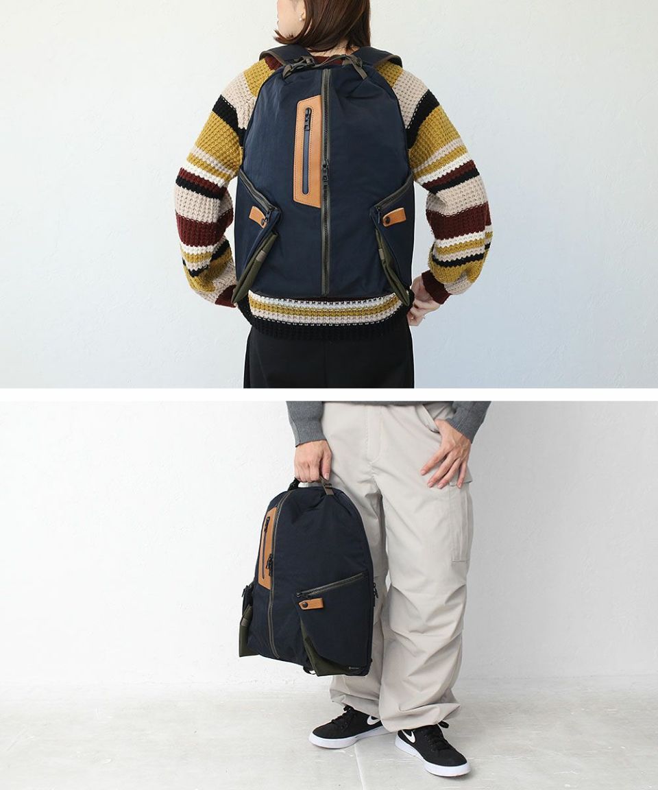 ジェット染色を施したマテリアル、身体に掛かる荷重の負荷を軽減するオリジナル機構の“m-strap”マグネット機能パーツを採用することで容易に開閉が可能になった収納部など、機能性だけでなくデザイン性も両立したバックパック。