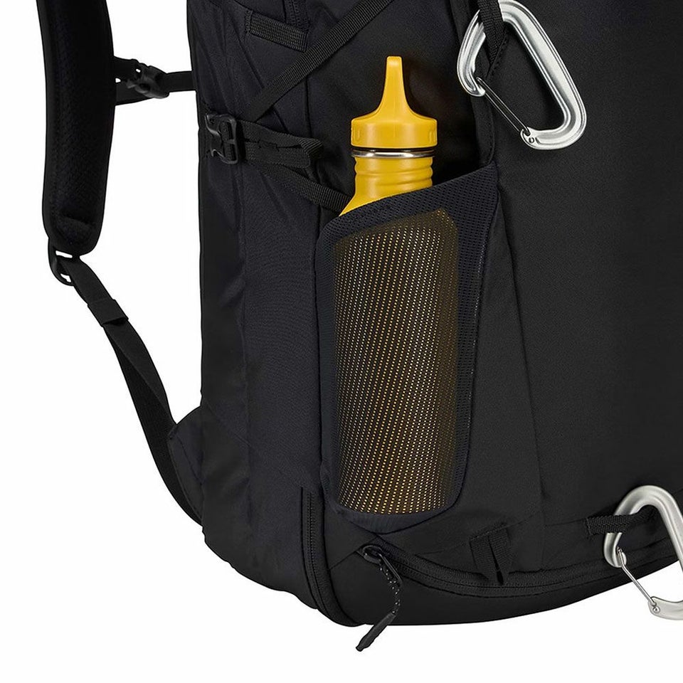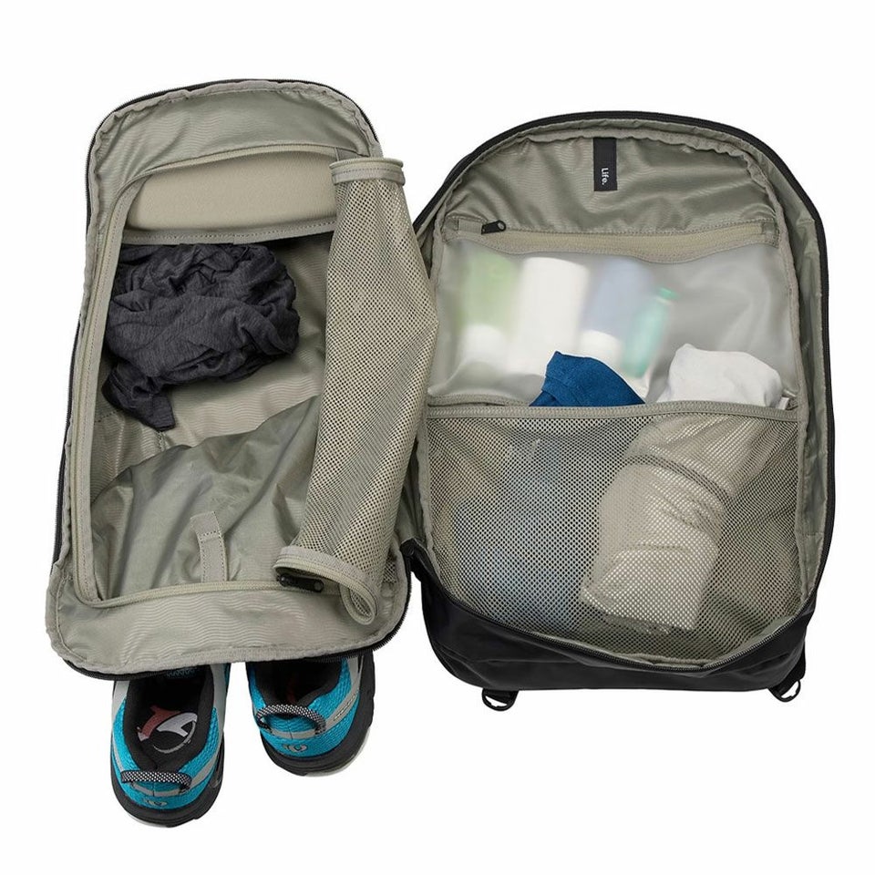 両開きジッパーでパッキングしやすく、メッシュパネルで荷崩れも防止。通気チャンネル付き背面、チェストストラップ、コンプレッションストラップが長時間でも快適な背負い心地を実現。