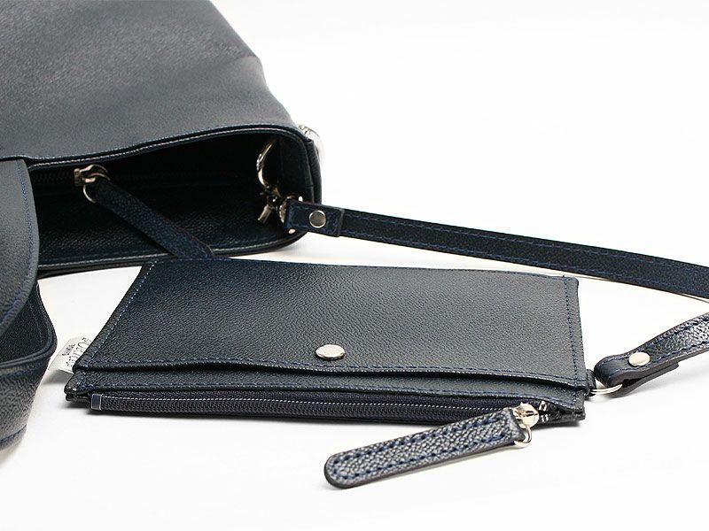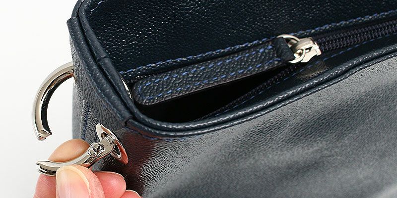 このリングを用いて付属のポーチを鞄本体の内側や外側のどちらにも取り付けることが出来ます。