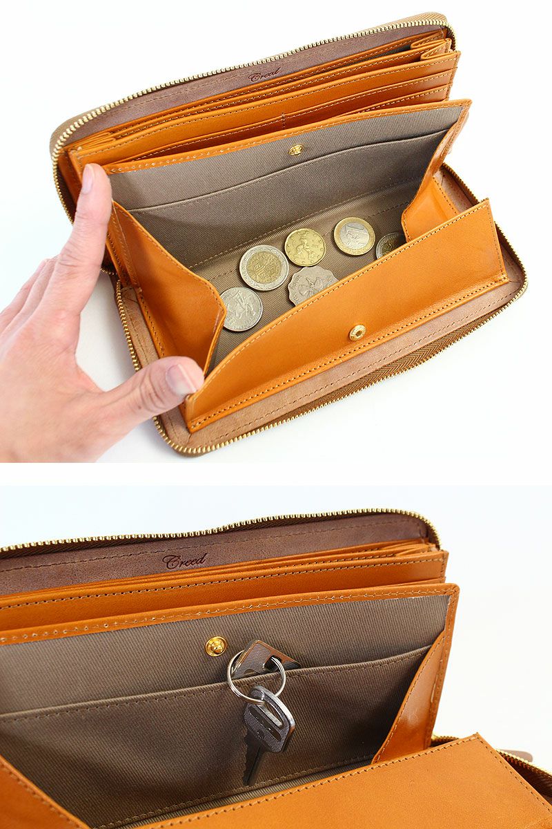 ファスナーで開閉するクリード シビラのラウンド長財布。