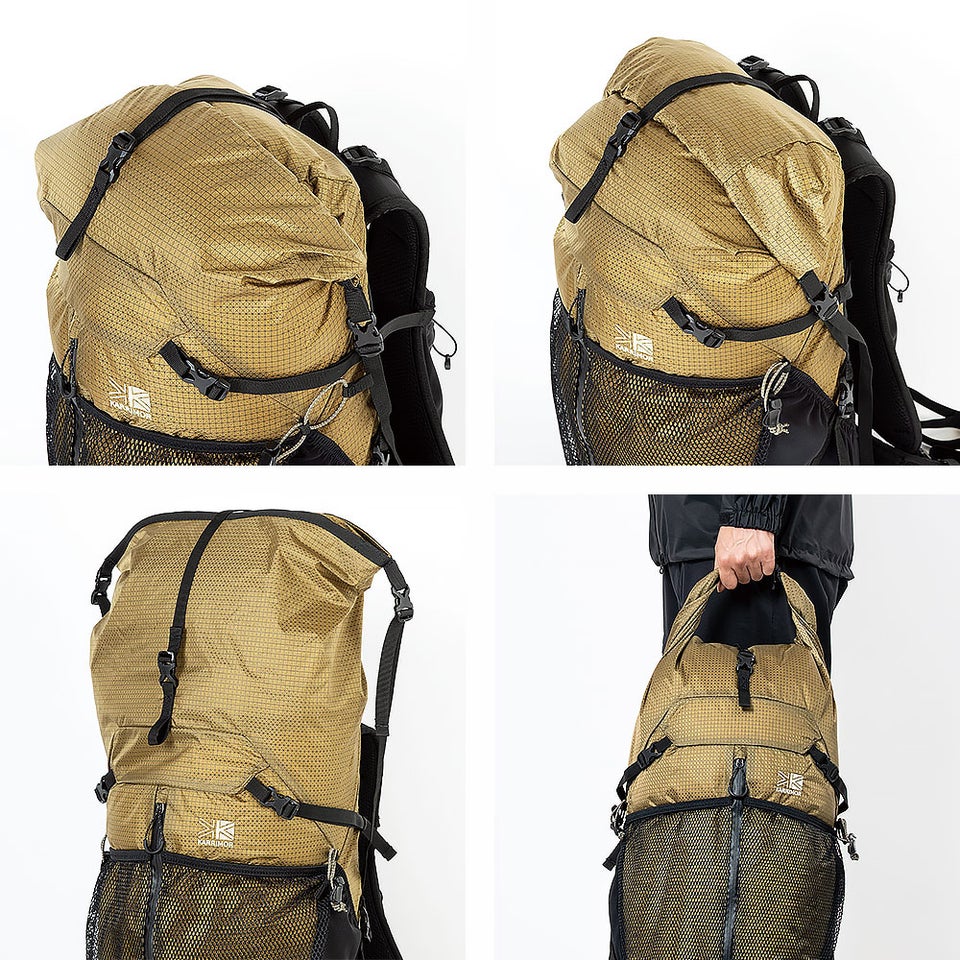 ロールトップ方式により荷物量に応じてサイズ調整が可能。少ない荷物の日はコンパクトに、多い日は大容量に対応します。巻き方も複数選べ、上部バックルを持ち手として使えるなど柔軟な使い方ができ、行動中の扱いやすさを高めます。