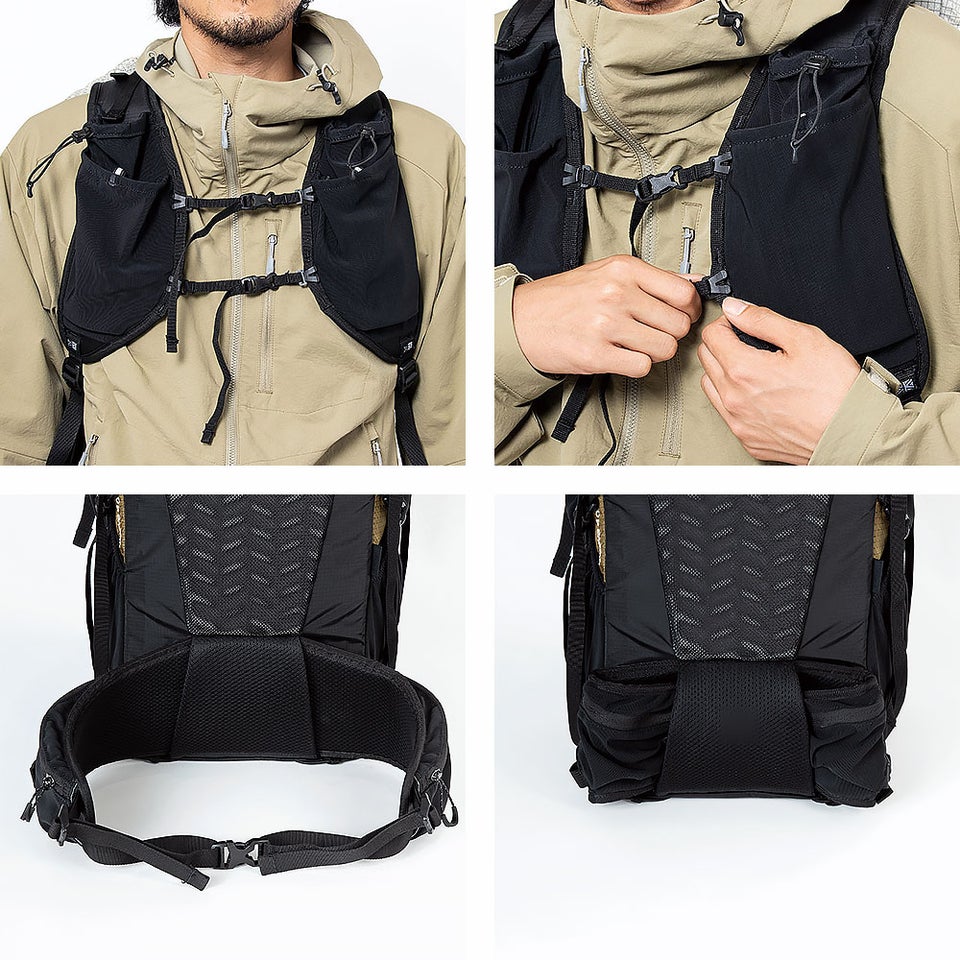 ユーティリティショルダーハーネスとチェストベルトが体にフィットし、荷重を分散。収納可能ヒップベルトが安定性を高め、長距離歩行でも疲れにくい設計です。背面長サイズ展開により体格に合わせて選べます。