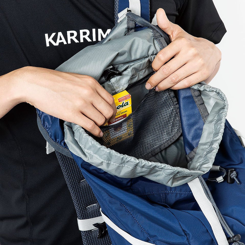 上部カバー付きの開口部は荷物量に応じて調整可能。雨の侵入を抑えながら効率よく収納できます。雨蓋内ポケットや吊りポケット、フロントポケットにより小物を整理しやすく、必要な物を迷わず取り出せるため行動中の動作を妨げません。