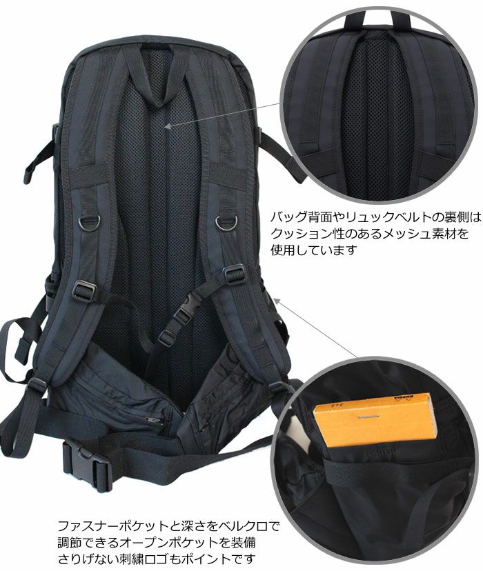 マットな質感、余計な装飾を除いたシンプルなルックス、使うほどに発見がある機能美で人気のシリーズ。マットブラックの超軽量高密度ナイロンに透湿加工を施し、抜群の撥水性と機能性を誇り、アウトドアのバックパックの野暮ったさやゴツさを排除した、都会的なイメージに仕上がっています。