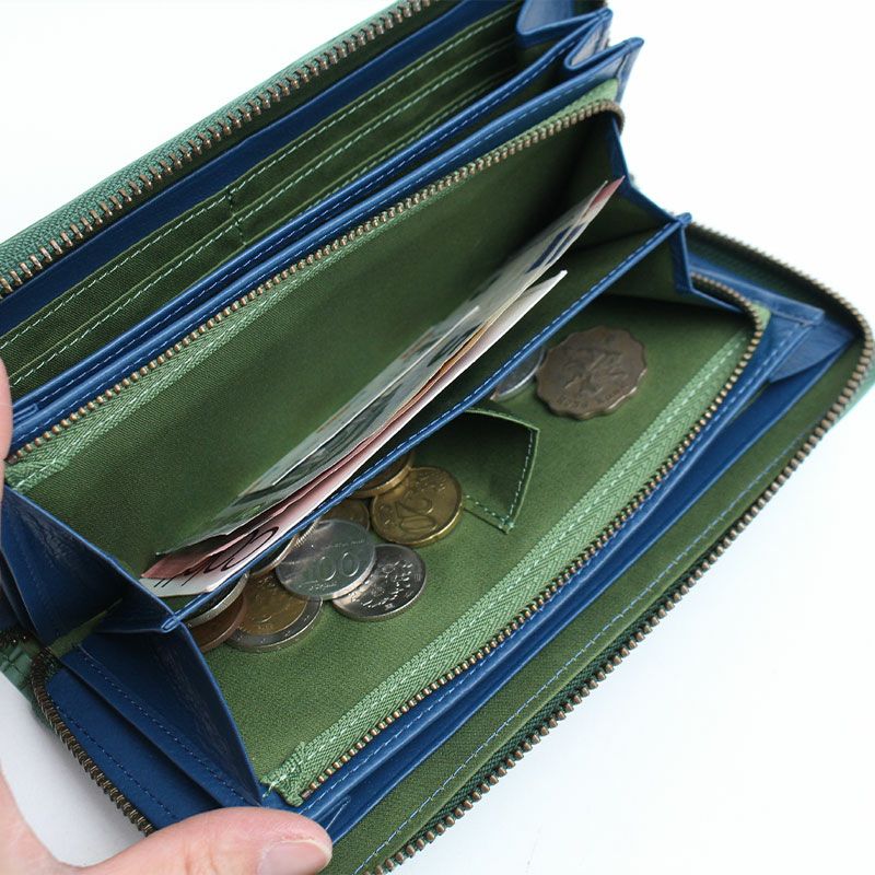 収納力が魅力のラウンドファスナータイプの長財布。札入れスペースは3室に分かれているのでご自身の使い勝手に合わせて収納できます。カードはたっぷり18枚収納。小銭入れも3つに仕切られているので、整理整頓がしやすくなっています。