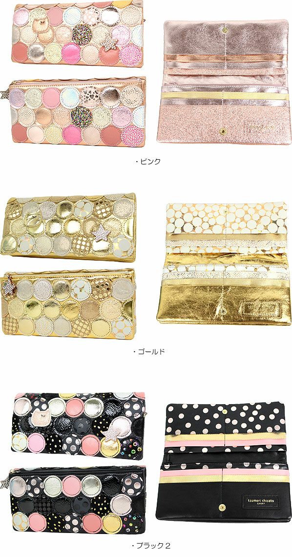 色々な素材やデザインをまん丸なカタチにパッチワークした大人かわいいツモリチサトの長財布。ドットのパッチワークの中にさり気なくツモリチサトおなじみのネコちゃんや、キラキララインストーンのキラキラ星がついています。内装にもドット柄を用いて、存在感タップリなサイフになること間違いナシ。ファスナーの持ち手にもキラキラ星が光っています。ブラック、ピンク、ゴールド共にキラキラと煌びやかなので金運UPも期待できそうですね。