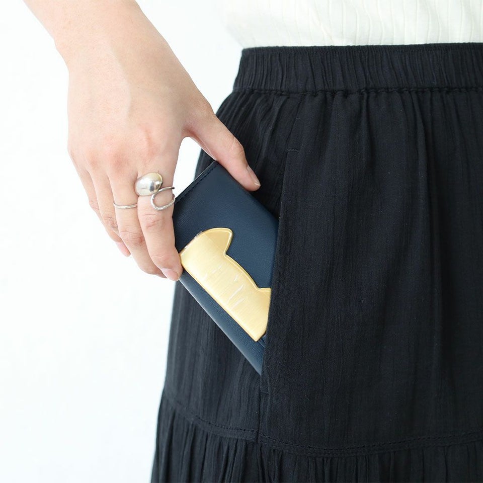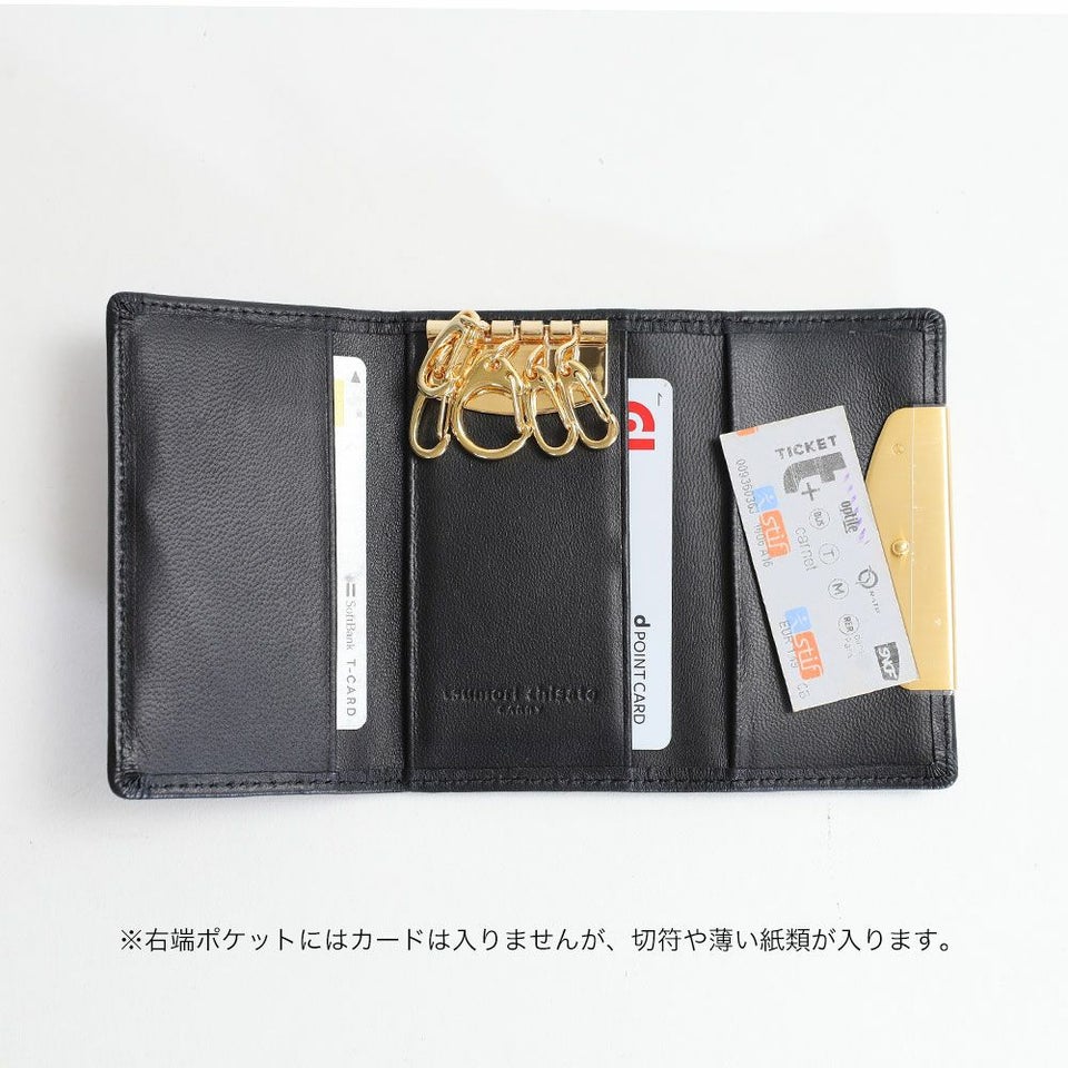 上質な素材感と金具のゴールドもマットなものを使用し、上品なムードに仕上げています。 素材を引き立てるシンプルなデザインです。 こちらはキーケース。 内側のキーフックは全部で5つ。 かぶせの裏などにミニポケットが2か所あります。 カラーは、ブラック、ピンク、ネイビー。 素材は、羊革(ラム)です。