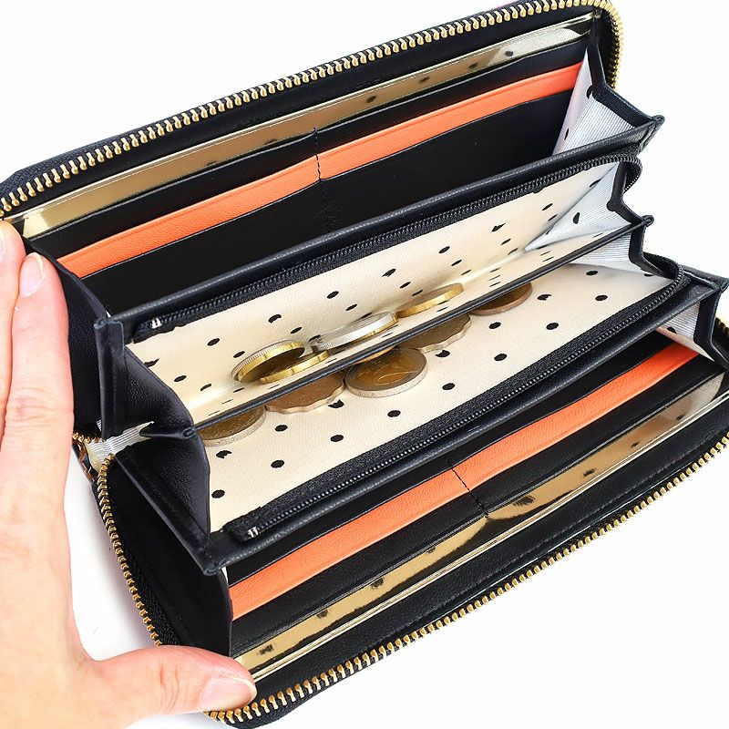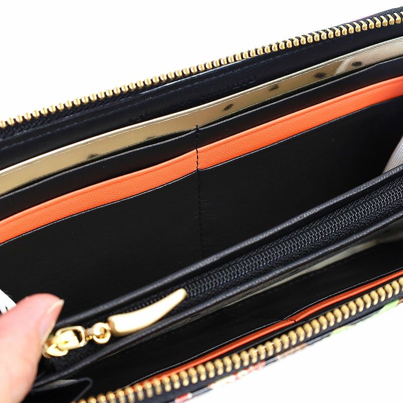 中身が確認しやすいラウンドファスナータイプのお財布で、内装はカードポケットが12か所、サブポケットが2か所、お札入れが2か所、Lファスナータイプの小銭入れがあります。