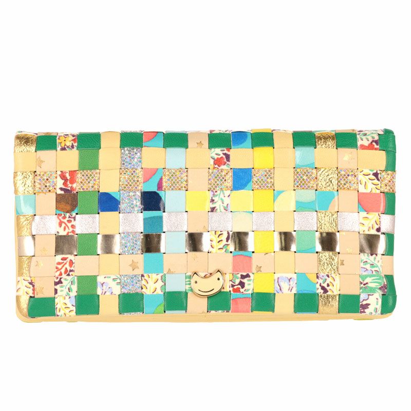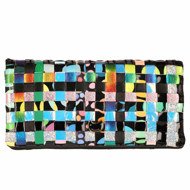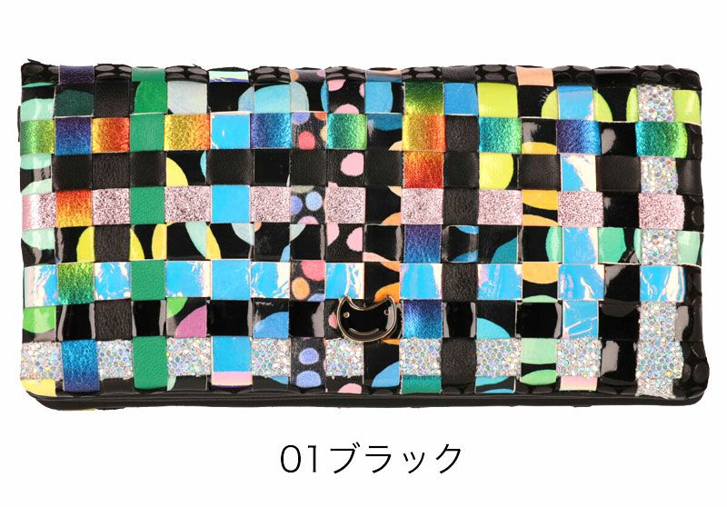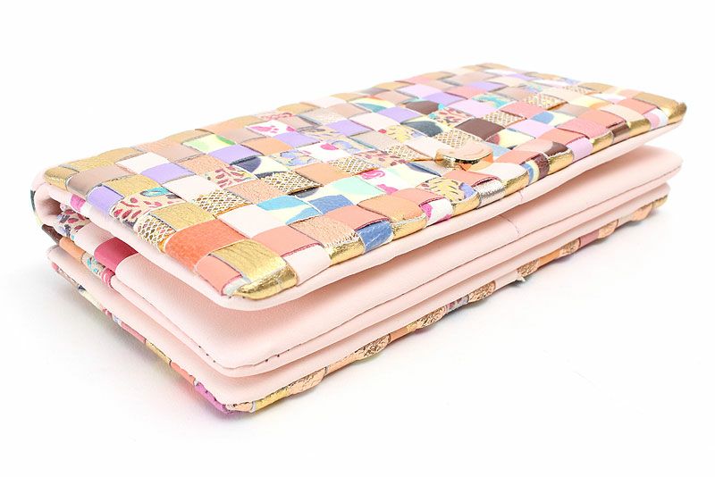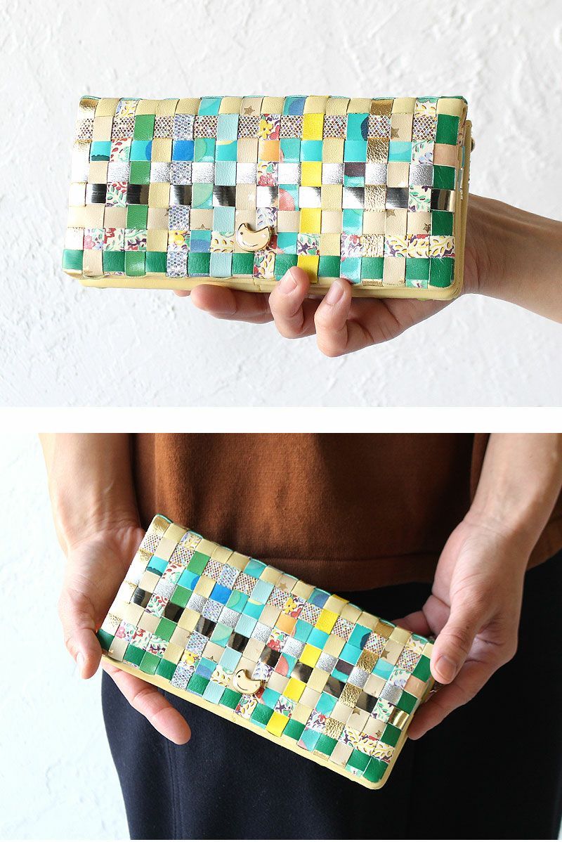 ドットや花柄等、異なる柄の生地を格子状に編みこんで、キュートで個性的な模様に仕上がったツモリチサトの長財布が登場。