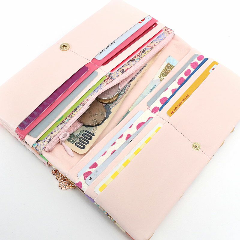 中央にはネコガオの金具がポイントとしてあしらわれており、キラキラと華やかなとびきり可愛いお財布です。
