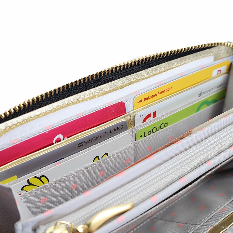 内側は小銭入れ、カードポケットが12か所、フリーポケットが4か所、お札入れが2か所と、収納力のある長財布となっております。