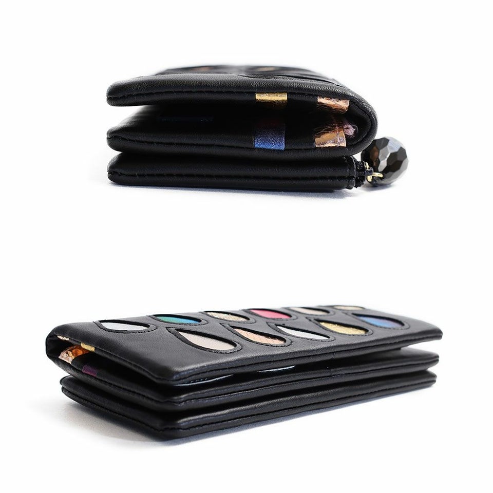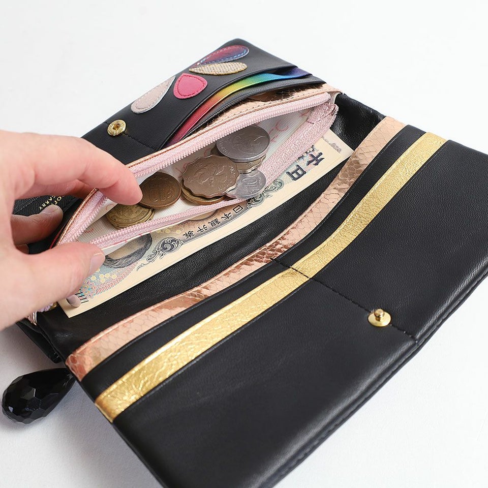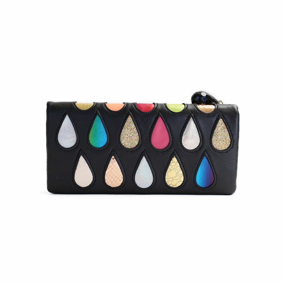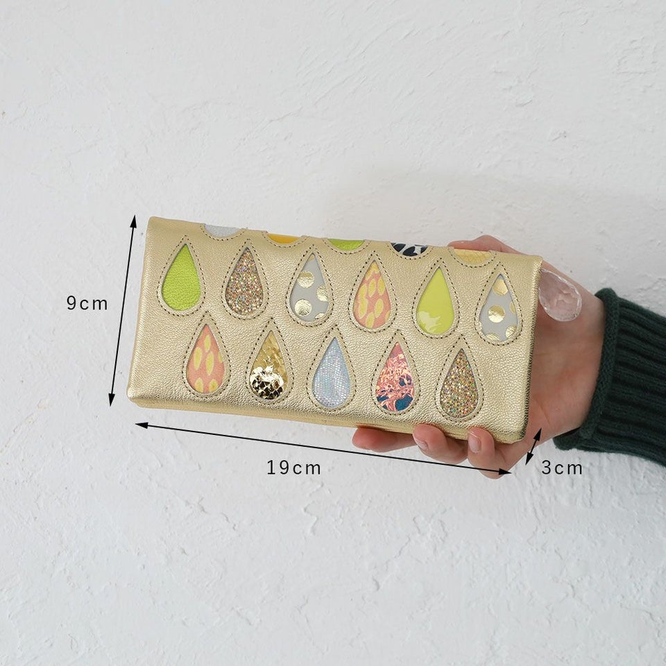 さまざまなレザーがしずく(drops)の形にパッチワークされた可愛らしいデザインの長財布。