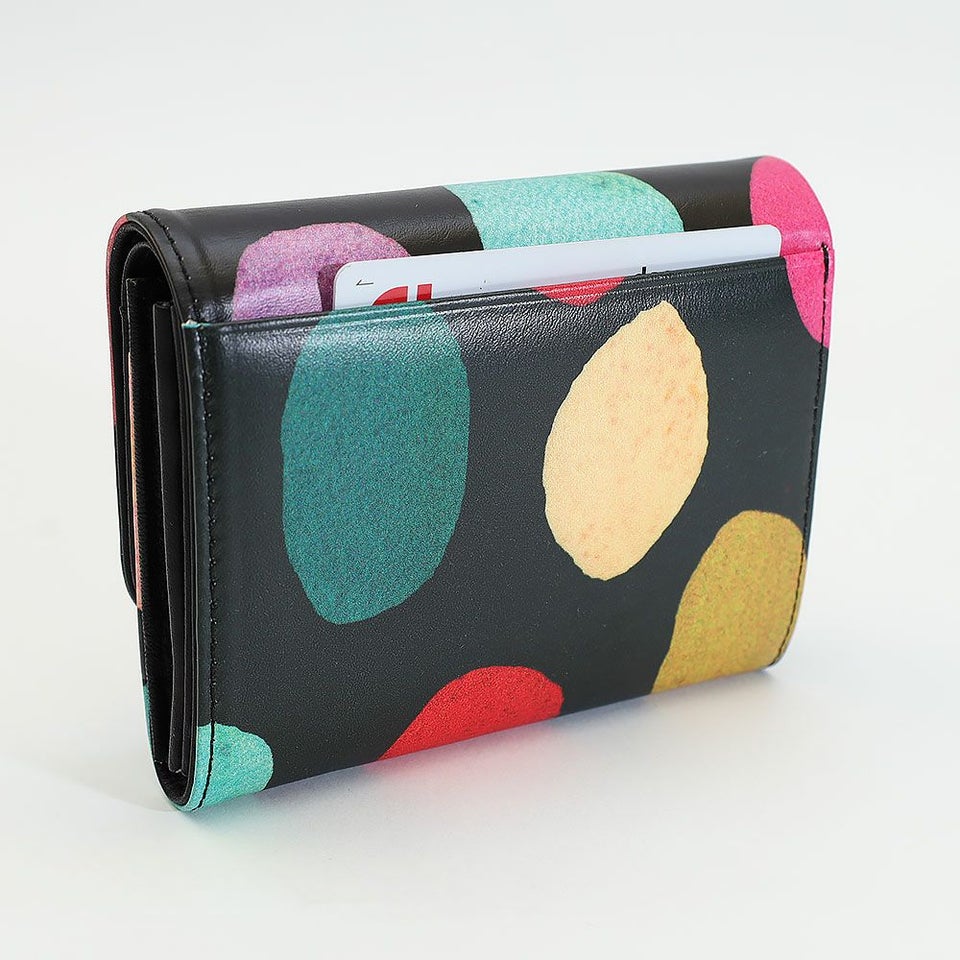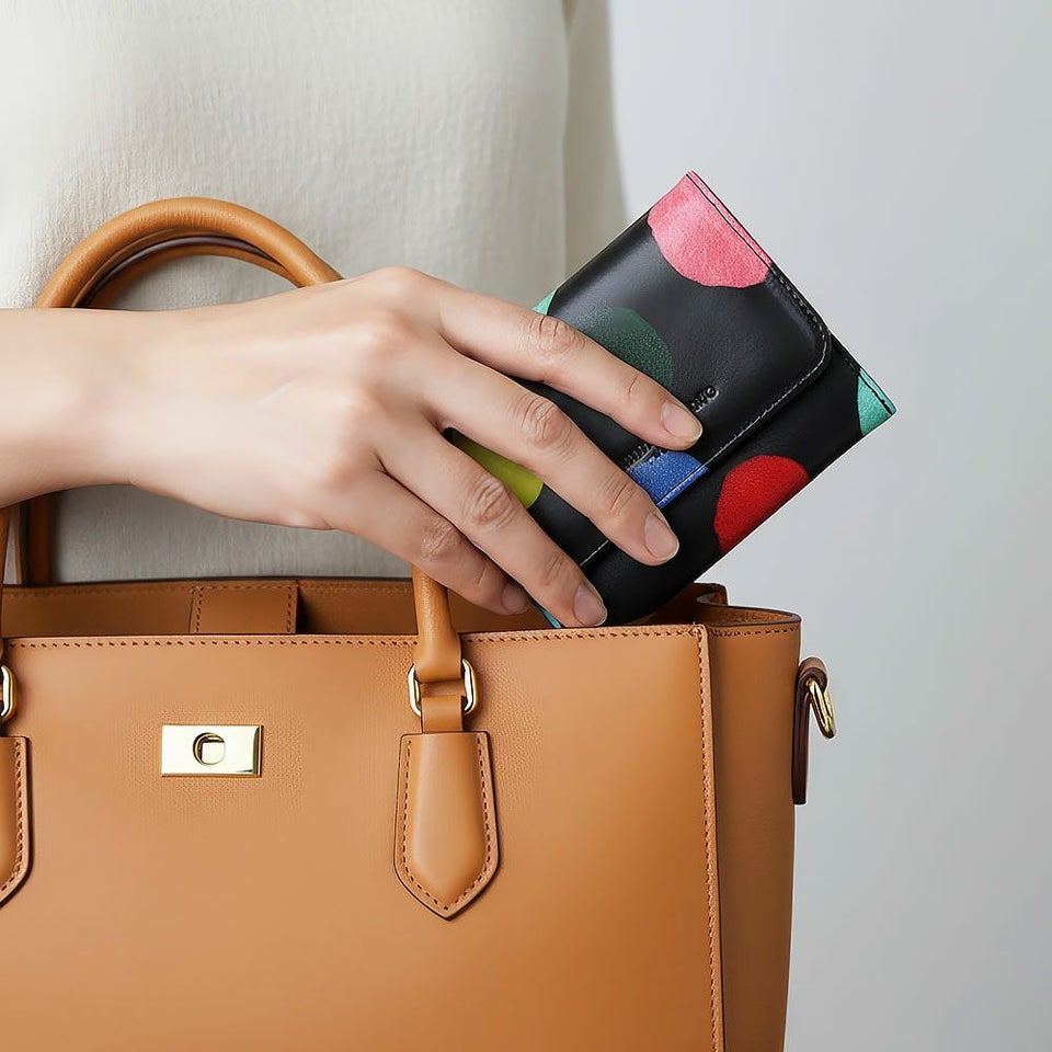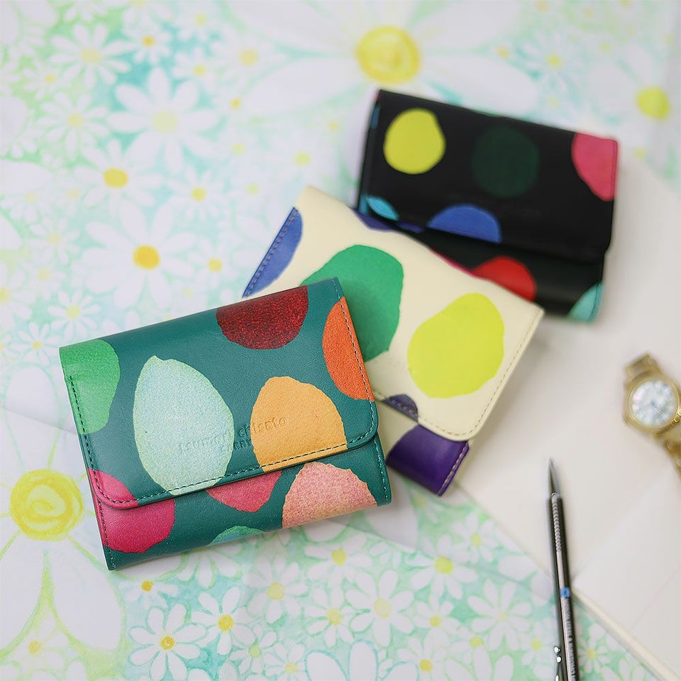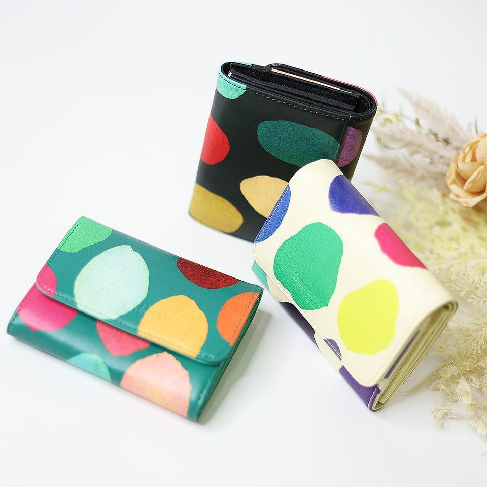 手描きのように滲んだカラフルドットが目を引くデザインで、持つたびに気分が明るくなる華やかさが魅力です。一点ずつ柄の表情が異なるため、自分だけの特別感を楽しめます。バッグの中でも存在感があり、毎日の相棒として愛着がわく一品です。