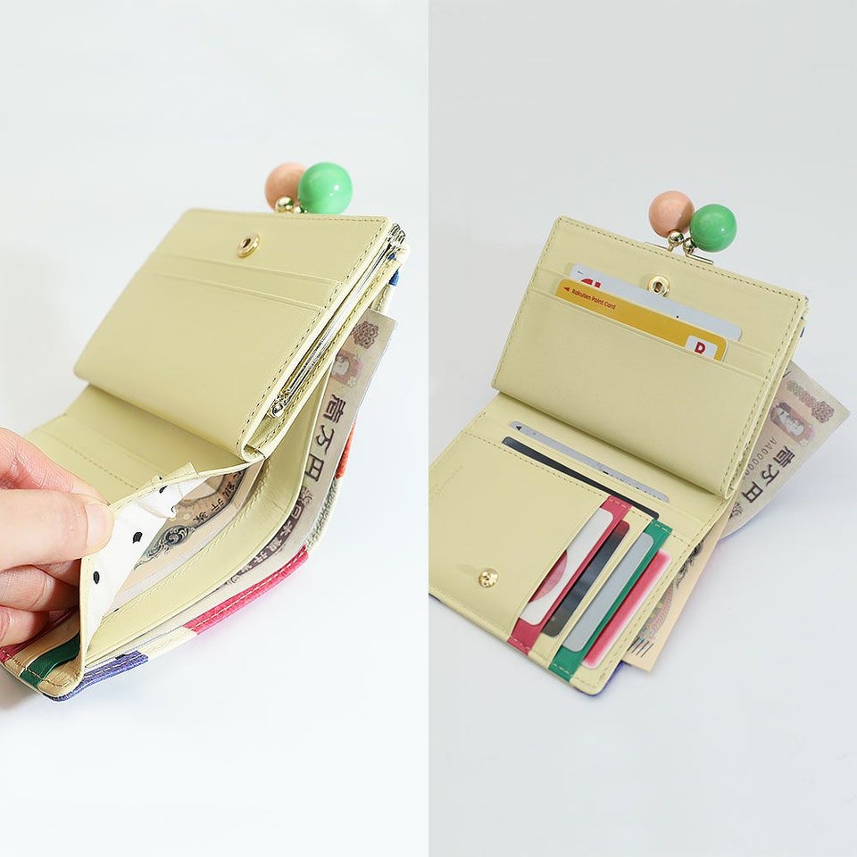 がま口のすっきりしたフォルムながら、カードポケットやオープンポケットなど実用性ある収納をしっかり確保。お札入れと小銭入れも備わり、必要なものをスマートに収められます。コンパクトと使いやすさを両立したバランスの良い構造です。