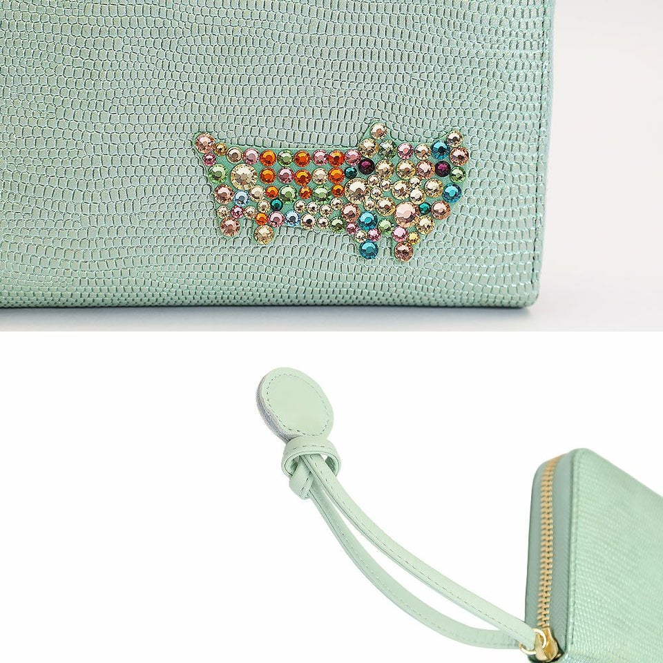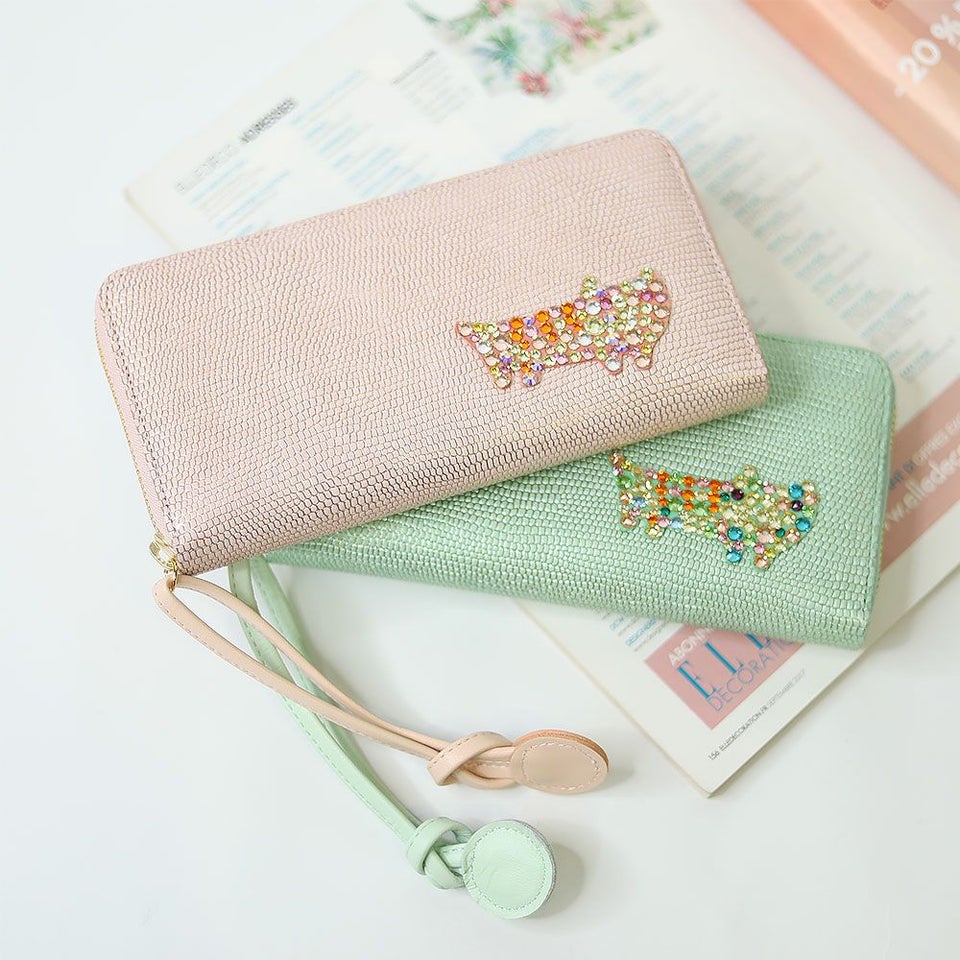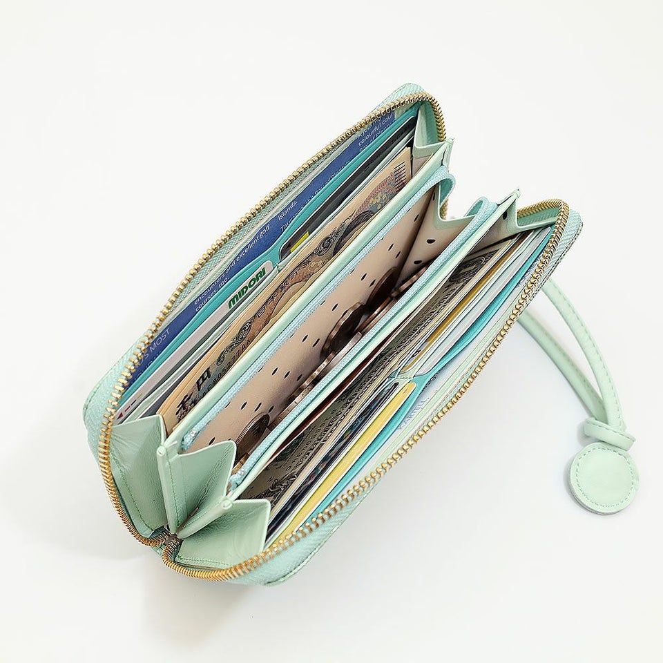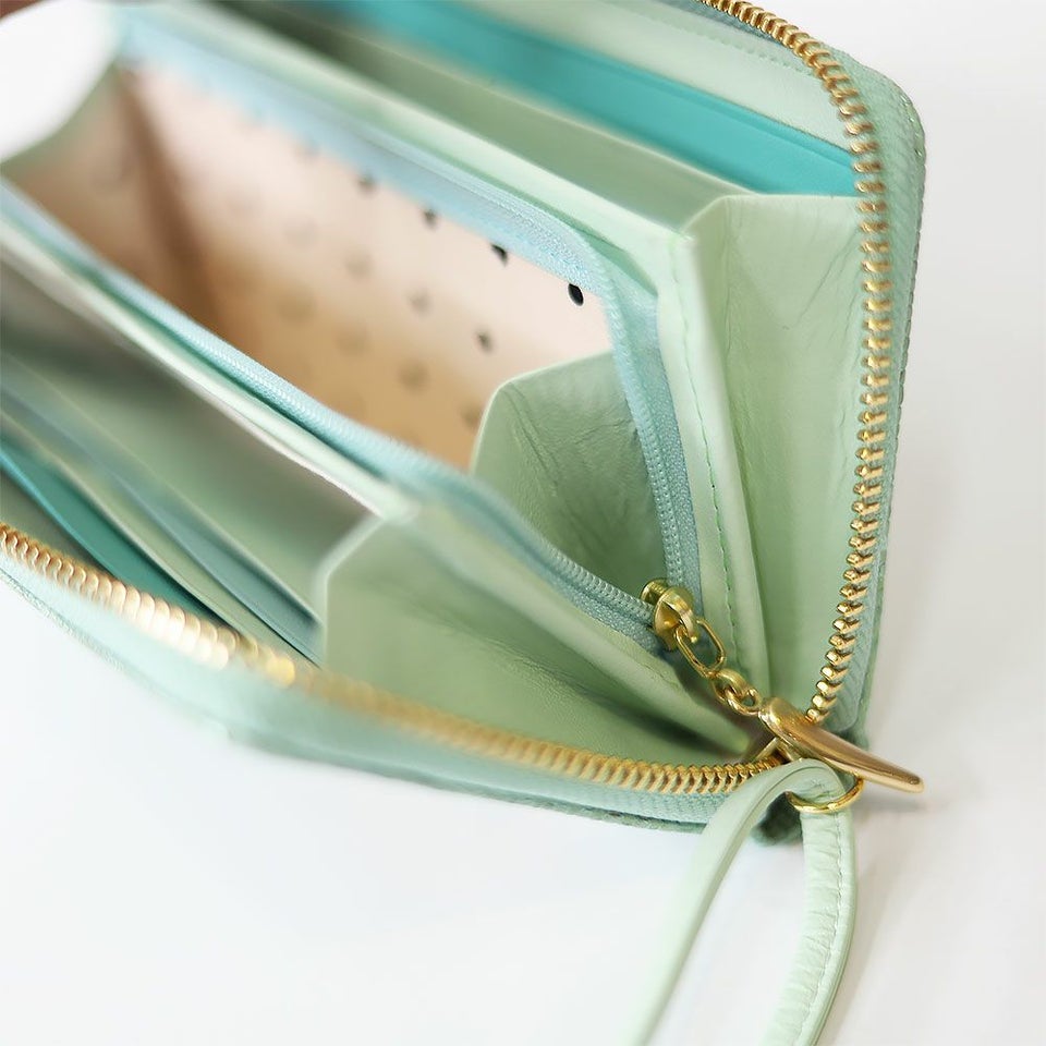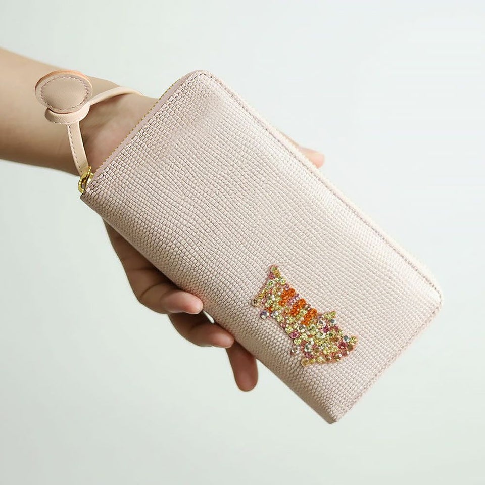 ラウンドファスナー仕様で中身がこぼれにくく、しっかりと閉じられる安心感があります。大きく開くため中が見渡しやすく、会計時もスムーズに使える長財布です。