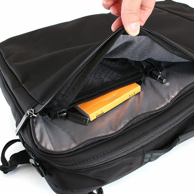 リュック使用の際には通常デッドスペースになりがちなフロントのトップ部分にはメガネやスマートフォンなどの小物を収納できるユーティリティポケットを配置。内側にキズがつきにくいパイル生地を使用しています。