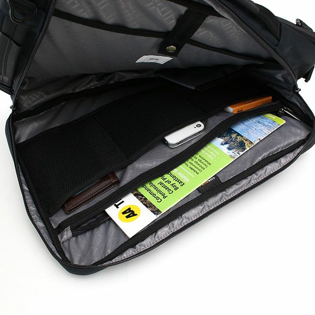 メイン気室の内装には書類の仕分けに便利なホック留めのオープンポケットに、小物整理の定番ファスナーポケット、ペットボトルや折りたたみ傘などを固定できるホルダーを装備。
