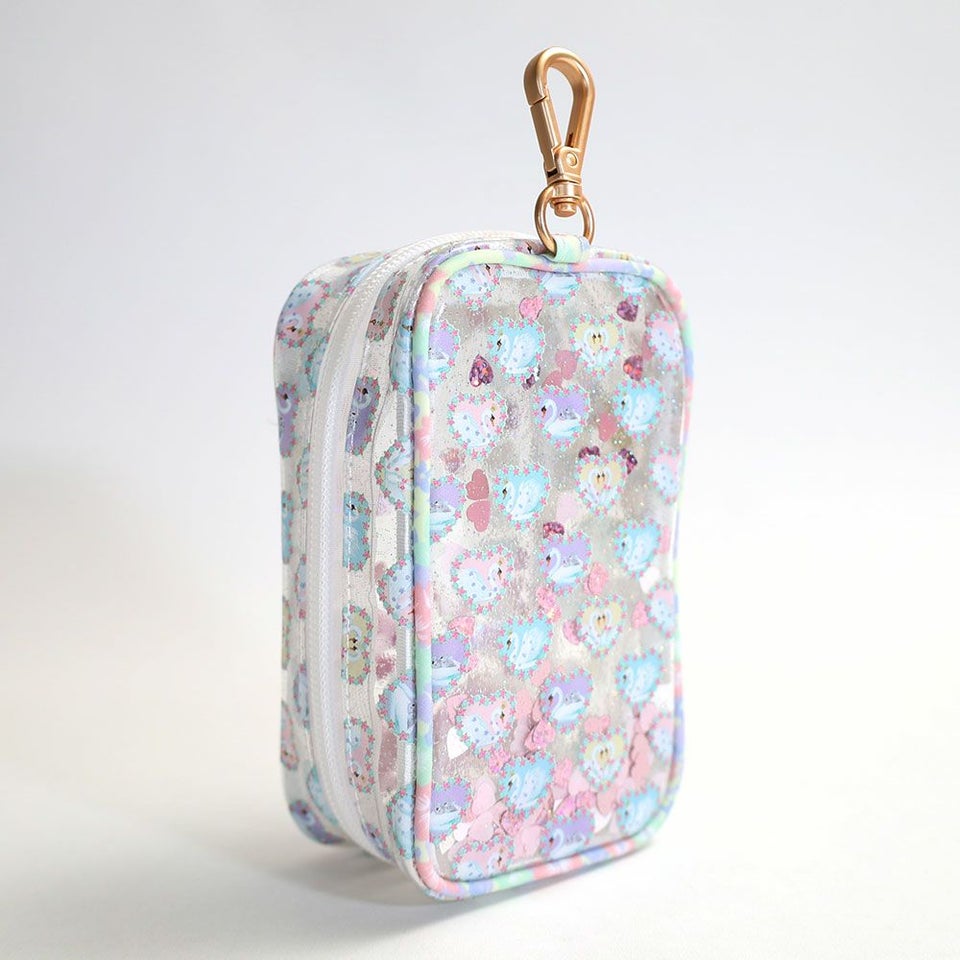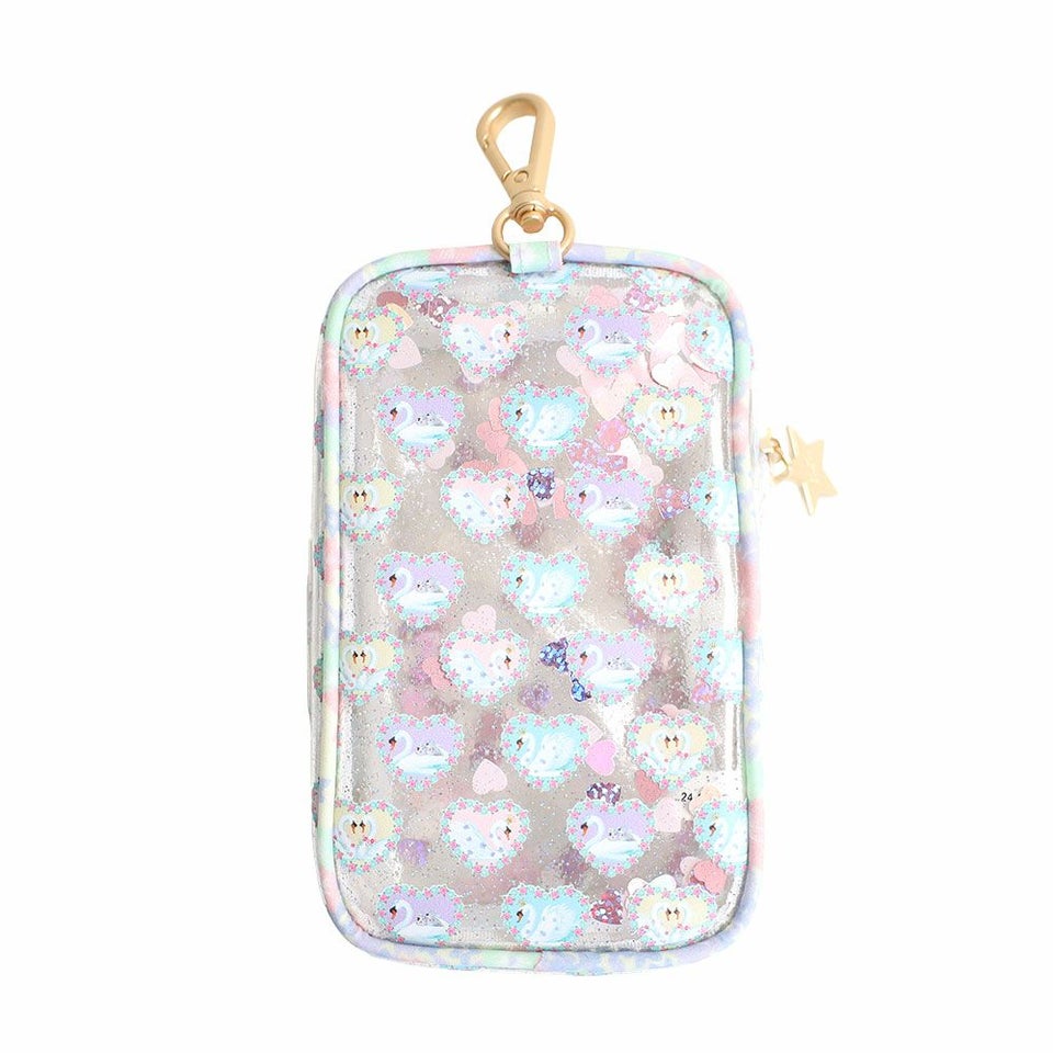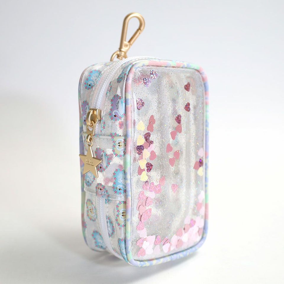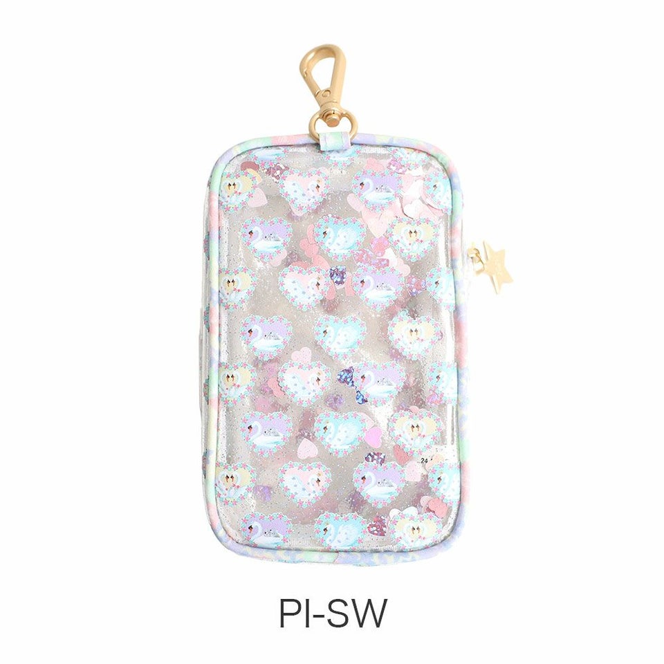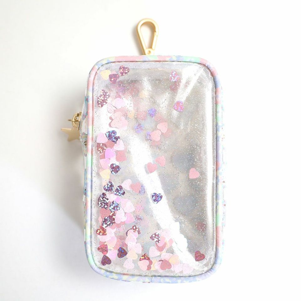 クリア素材にラメを散りばめ、揺れるスパンコールが華やかに演出。光を受けるたびにきらめき、持ち歩くだけで注目を集めるアクセサリー感覚のポーチです。