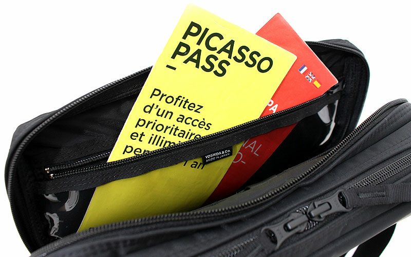 一層目にはクリアのファスナーポケット、オープンポケットが3つ、カードポケットが2つ、面ファスナー付きのポケットが1つ完備されています。