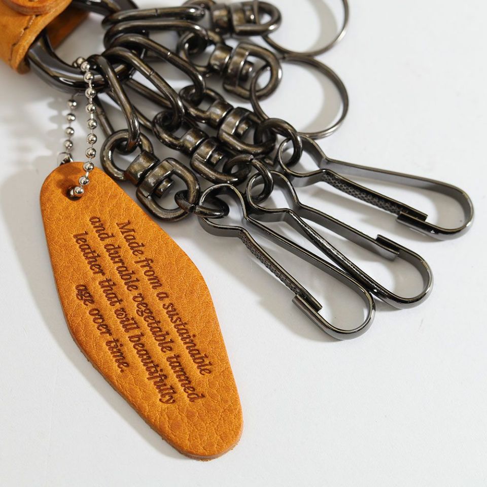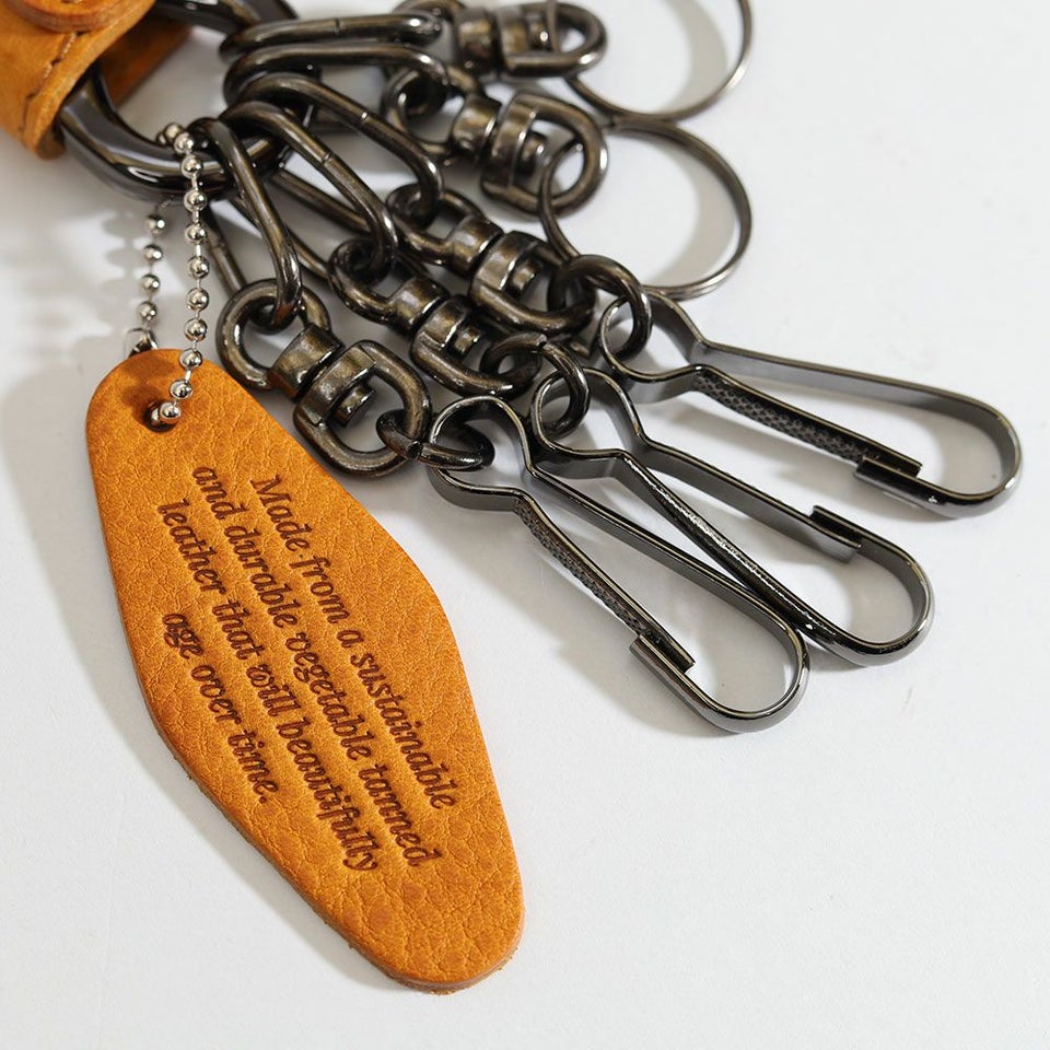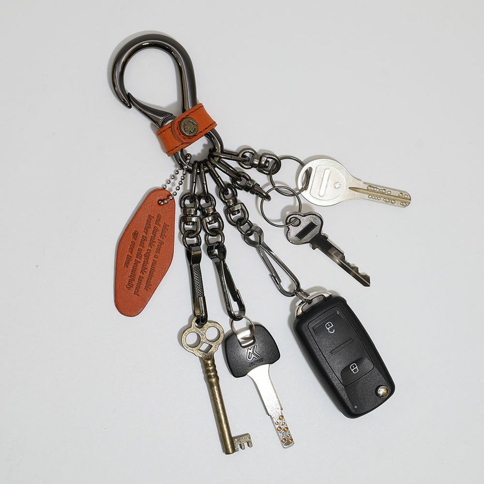 異なる2種の形状の5つのキーフックで、鍵を種類別に整理可能。ナスカン付きでバッグやベルトに簡単に装着でき、使い勝手も抜群です。