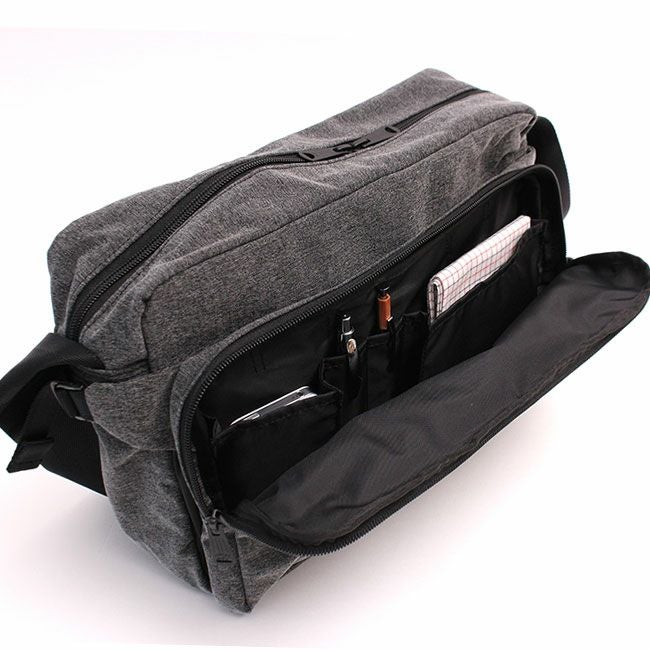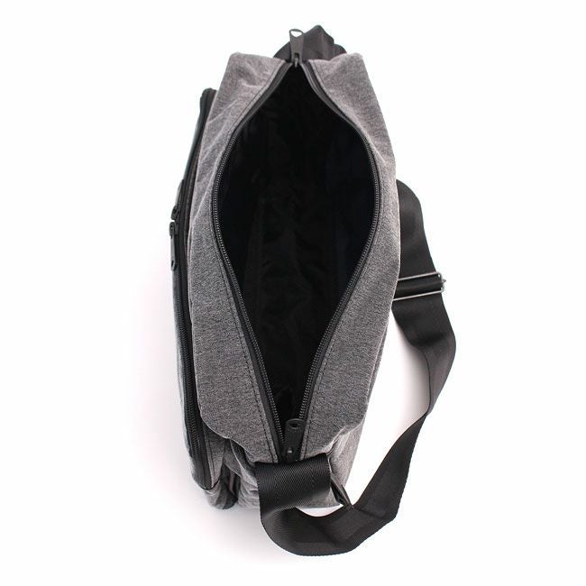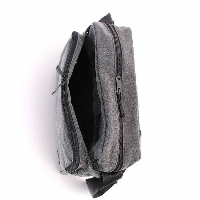 機能的なあおりポケットをデザインポイントにしたカジュアルシリーズです。様々なシーンでカバンの中からスムーズに荷物を取り出せることを想定して、フロントに機能的なあおりポケットを設けました。メイン素材は、タテ糸がナイロン糸、ヨコ糸はナイロンとポリエステルを撚り合わせた糸でヘリンボーンに織りました。また生地の風合いを出すために塩縮加工※を施して生地にボリューム感を出し、加工によって生じる適度なシワ感とコットンライクな風合いが、よりカジュアルな雰囲気を強めています。塩縮加工後にナイロンのみを液流染めという独特のシワが出る方法で黒く染めることで、柔らかでナチュラルな雰囲気が漂う杢調に仕上げました。内装の一部には、糸の段階でセラミック系の抗菌剤を練り込み、さらにデオドラント加工を施すことで制菌・抗菌・防臭・消臭機能を持つバイオライナーR を使用しています。