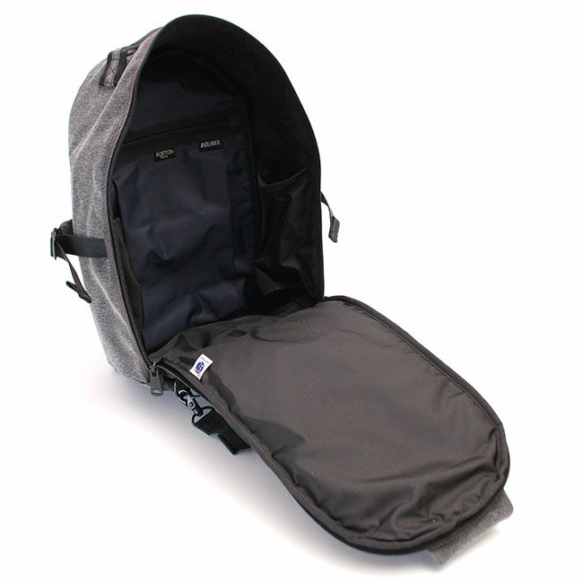 機能的なあおりポケットをデザインポイントにしたカジュアルシリーズです。様々なシーンでカバンの中からスムーズに荷物を取り出せることを想定して、フロントに機能的なあおりポケットを設けました。メイン素材は、タテ糸がナイロン糸、ヨコ糸はナイロンとポリエステルを撚り合わせた糸でヘリンボーンに織りました。また生地の風合いを出すために塩縮加工※を施して生地にボリューム感を出し、加工によって生じる適度なシワ感とコットンライクな風合いが、よりカジュアルな雰囲気を強めています。塩縮加工後にナイロンのみを液流染めという独特のシワが出る方法で黒く染めることで、柔らかでナチュラルな雰囲気が漂う杢調に仕上げました。内装の一部には、糸の段階でセラミック系の抗菌剤を練り込み、さらにデオドラント加工を施すことで制菌・抗菌・防臭・消臭機能を持つバイオライナーR を使用しています。