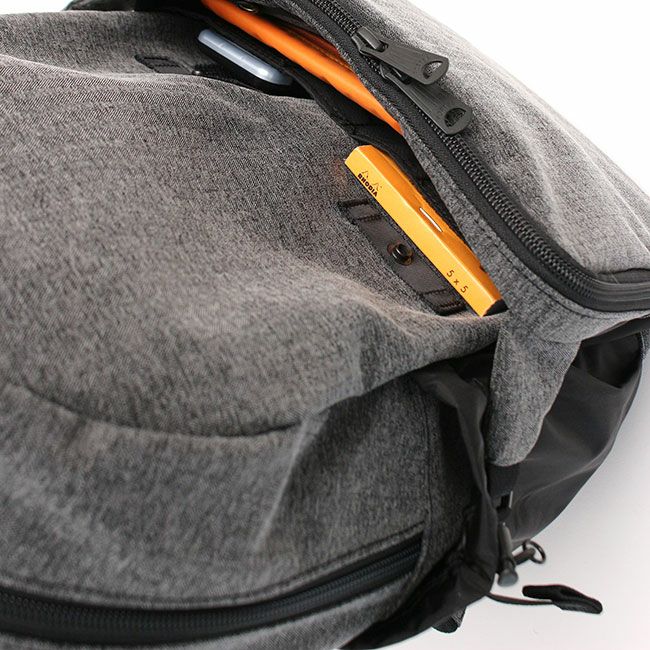 機能的なあおりポケットをデザインポイントにしたカジュアルシリーズです。様々なシーンでカバンの中からスムーズに荷物を取り出せることを想定して、フロントに機能的なあおりポケットを設けました。メイン素材は、タテ糸がナイロン糸、ヨコ糸はナイロンとポリエステルを撚り合わせた糸でヘリンボーンに織りました。また生地の風合いを出すために塩縮加工※を施して生地にボリューム感を出し、加工によって生じる適度なシワ感とコットンライクな風合いが、よりカジュアルな雰囲気を強めています。塩縮加工後にナイロンのみを液流染めという独特のシワが出る方法で黒く染めることで、柔らかでナチュラルな雰囲気が漂う杢調に仕上げました。内装の一部には、糸の段階でセラミック系の抗菌剤を練り込み、さらにデオドラント加工を施すことで制菌・抗菌・防臭・消臭機能を持つバイオライナーR を使用しています。