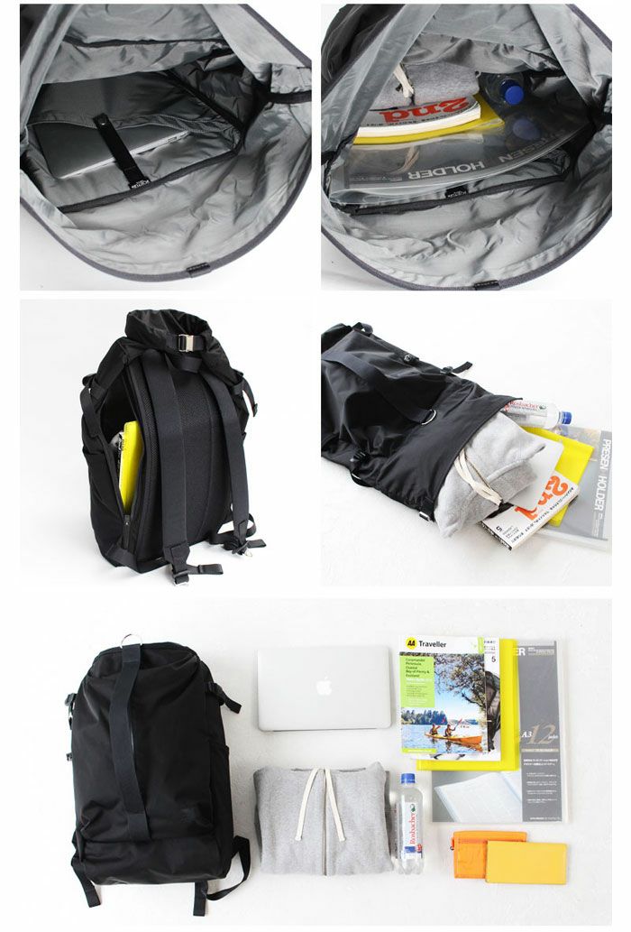 収納部の開閉やショルダーストラップの調節など、カバンを使用する際に必要な動作に面白みのある感覚的な操作方法を要所に取り入れています。また、ブラックで統一した素材に対して操作する箇所に金属のシルバーを効かせることで、シンプルなデザインのアイテムの中で特徴的なディテールが機能的なデザインアクセントにもなっています。