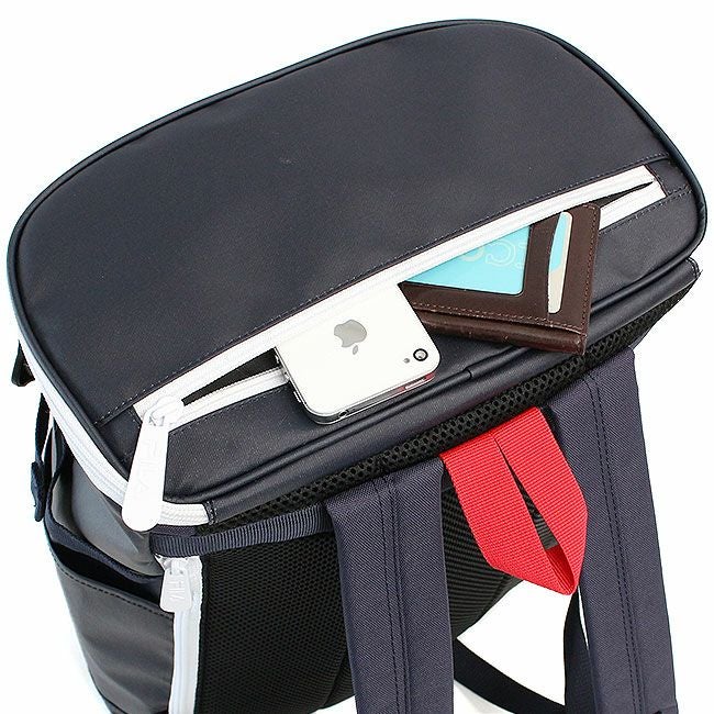 上部や前面にファスナー開閉のポケットつきで、パスケースや携帯電話などのよく使う小物をいれるのにもオススメです。