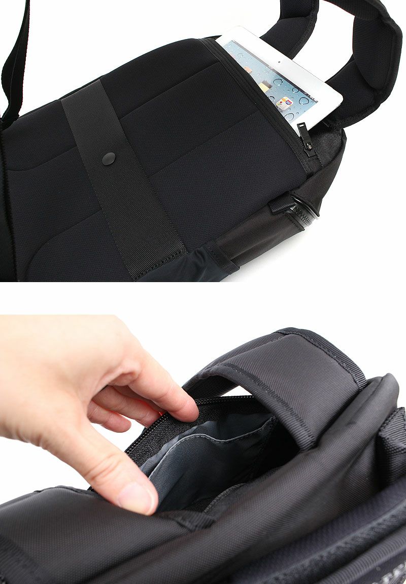 ショルダーストラップやリュックストラップにストレッチ性のあるポリエステルニット素材のポケットを備え
