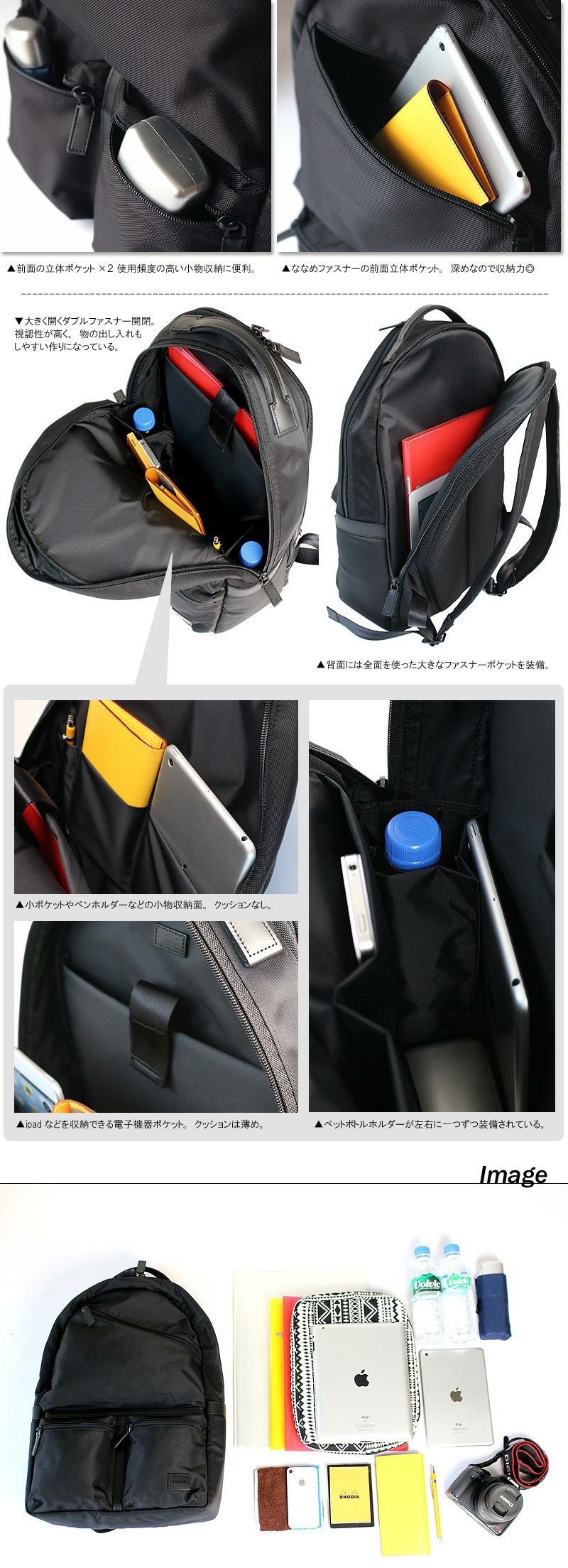全型共通でノートPCもしくはタブレットが収納可能なクッション材入りのポケットを本体内装に備えており、出張時などにも便利です。また、しっかりとしたフォルムを形作るために本体の前面と背面、底部には芯材を入れているため、自立しやすいのも特徴です。ショルダーバッグ、デイパック以外の型は背面にキャリーバー通しを設けており、キャリーケースとのセットアップができます。