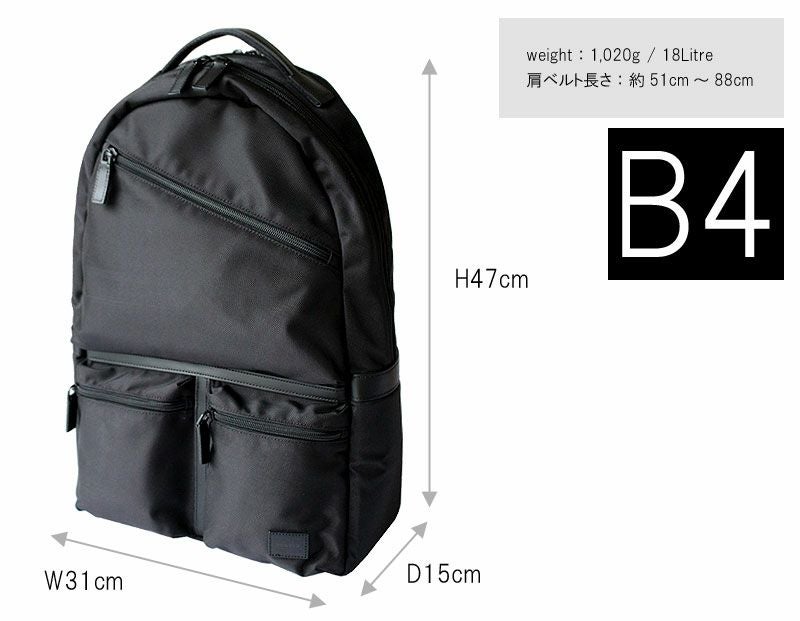 素材は高分子化学をベースとした先端テクノロジーから生まれた、1260デニールの超高強力66ナイロン糸をオックス織りにした生地で、一般的なナイロン生地に比べて約2倍の引裂強度と約1.6倍の引張強度を備えています。この生地は紡糸から製織工程まで日本国内で行なっているメイド イン ジャパンの素材です。