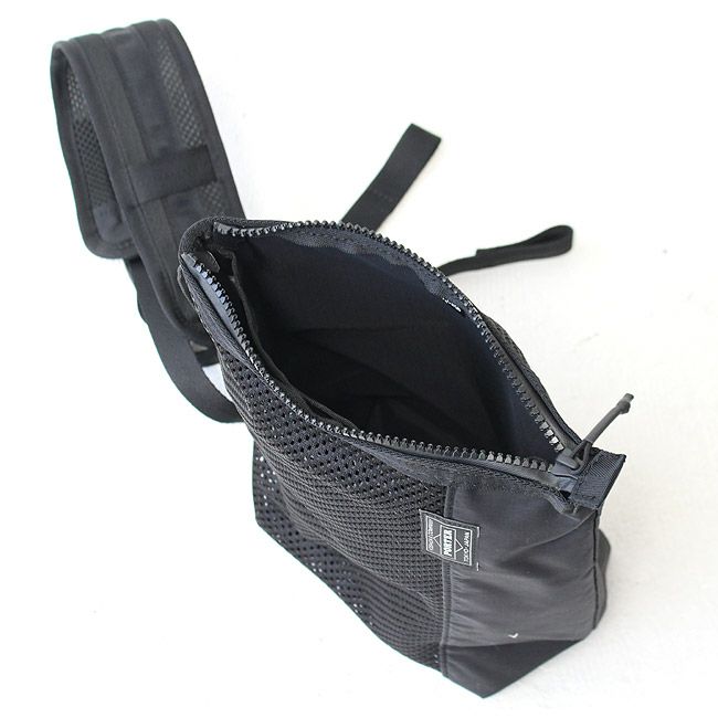 内装生地のPVC加工は光沢を強め、リップストップの目が出るように特殊な方法でコーティングをしており、メッシュ越しにその素材感をのぞかせることでバッグ自体の見た目もシンプルながら非常に特徴のある印象に仕上げられています。