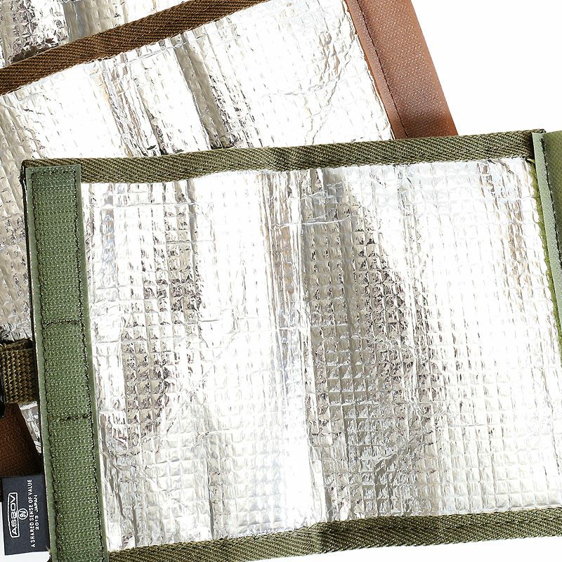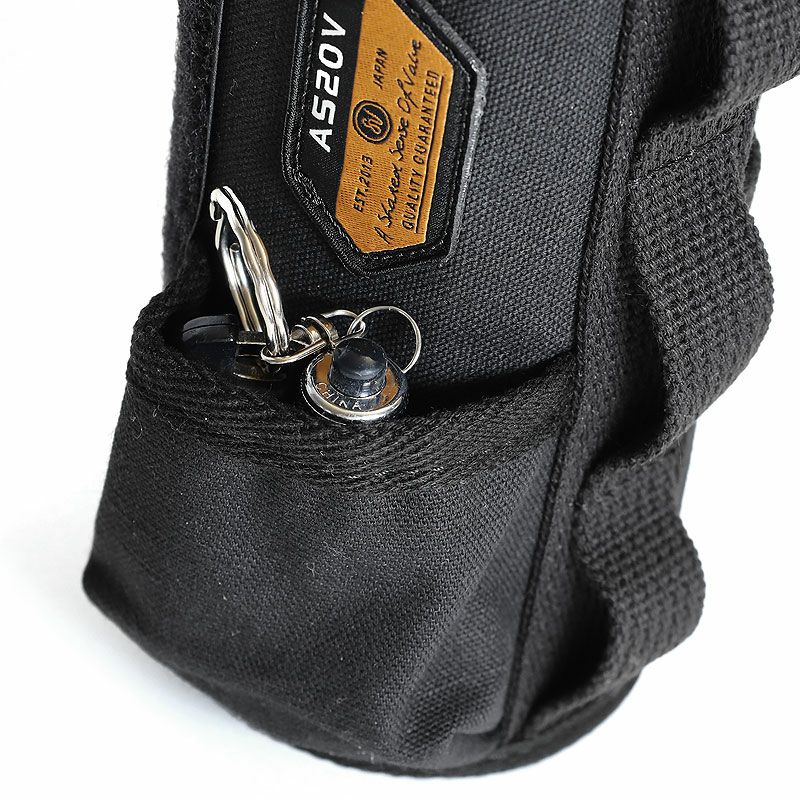内側には保温保冷素材を使用、カラビナをつけることで様々なところへ引っ掛けることが可能です。
