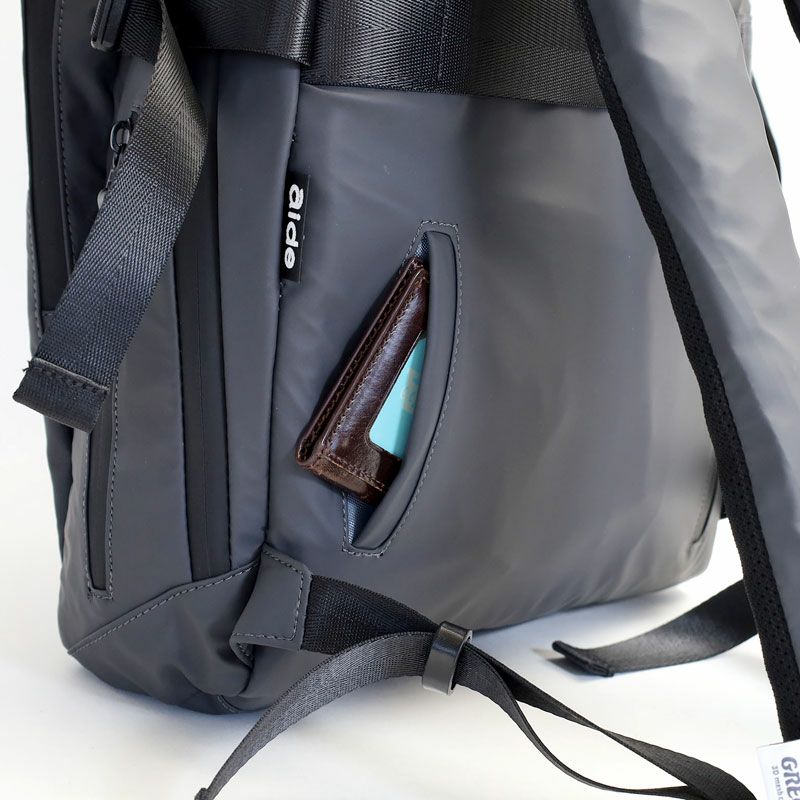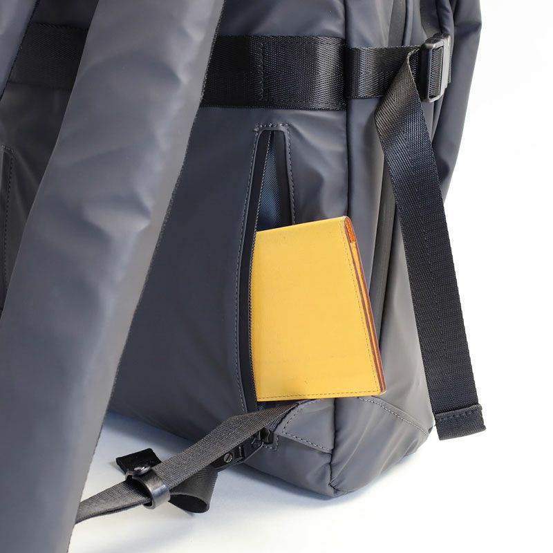 背面右側下部にはファスナーポケットが。財布など貴重品が収納できます。