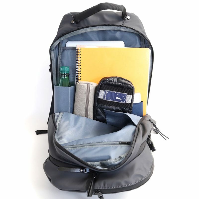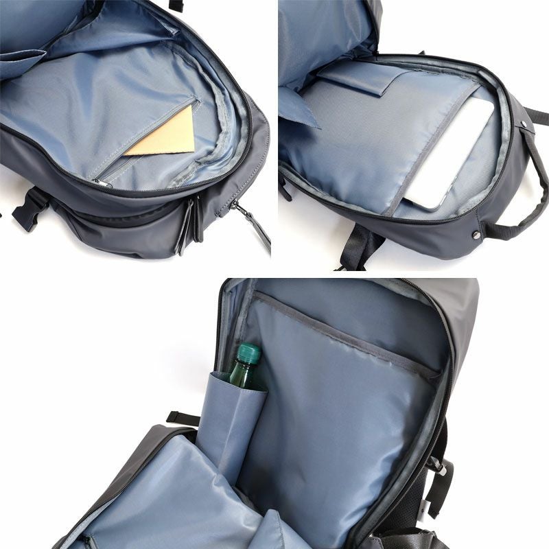 3層に別れたメインスペースと、ビジネス周辺アイテム以外も多数収納できるよう各所にポケットを配置。