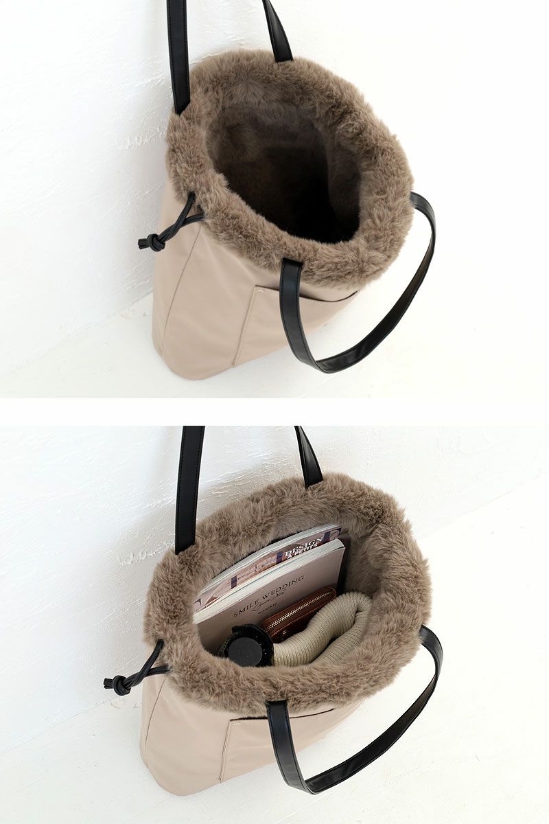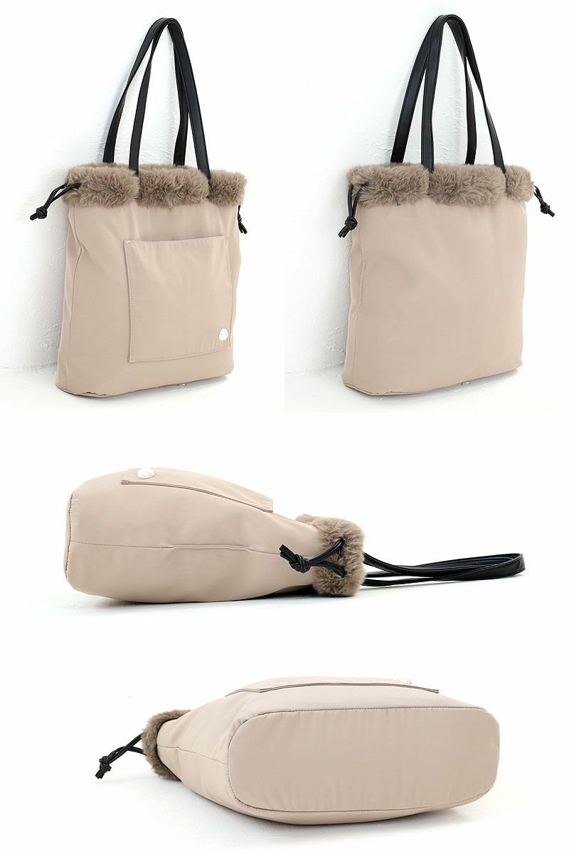 かわいいファー巾着トートにもなり、様々なフォルムになるので 気分によって色々と変えられるのが嬉しいところ。