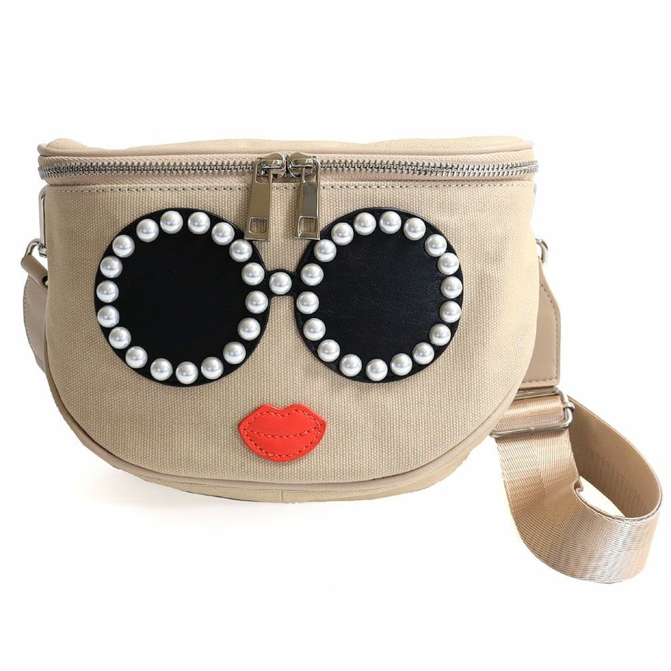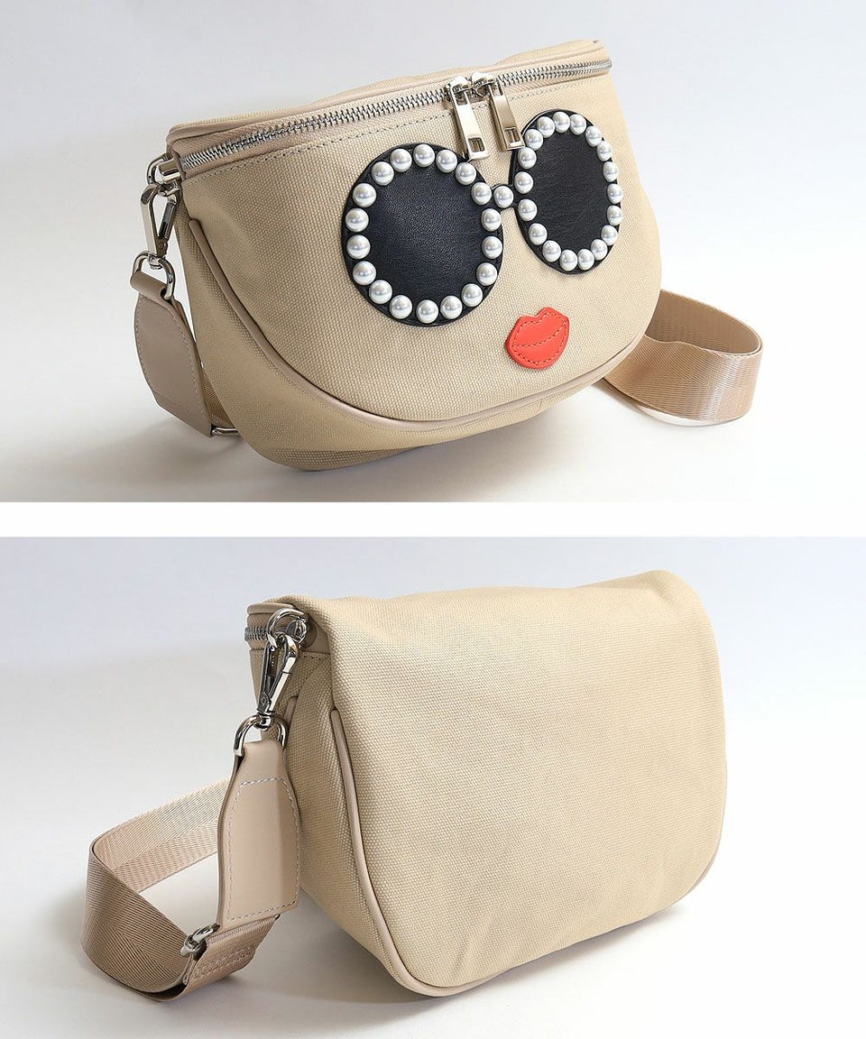 パールで縁取られたサングラスが特徴的なキャンバスショルダーバッグ 送料無料