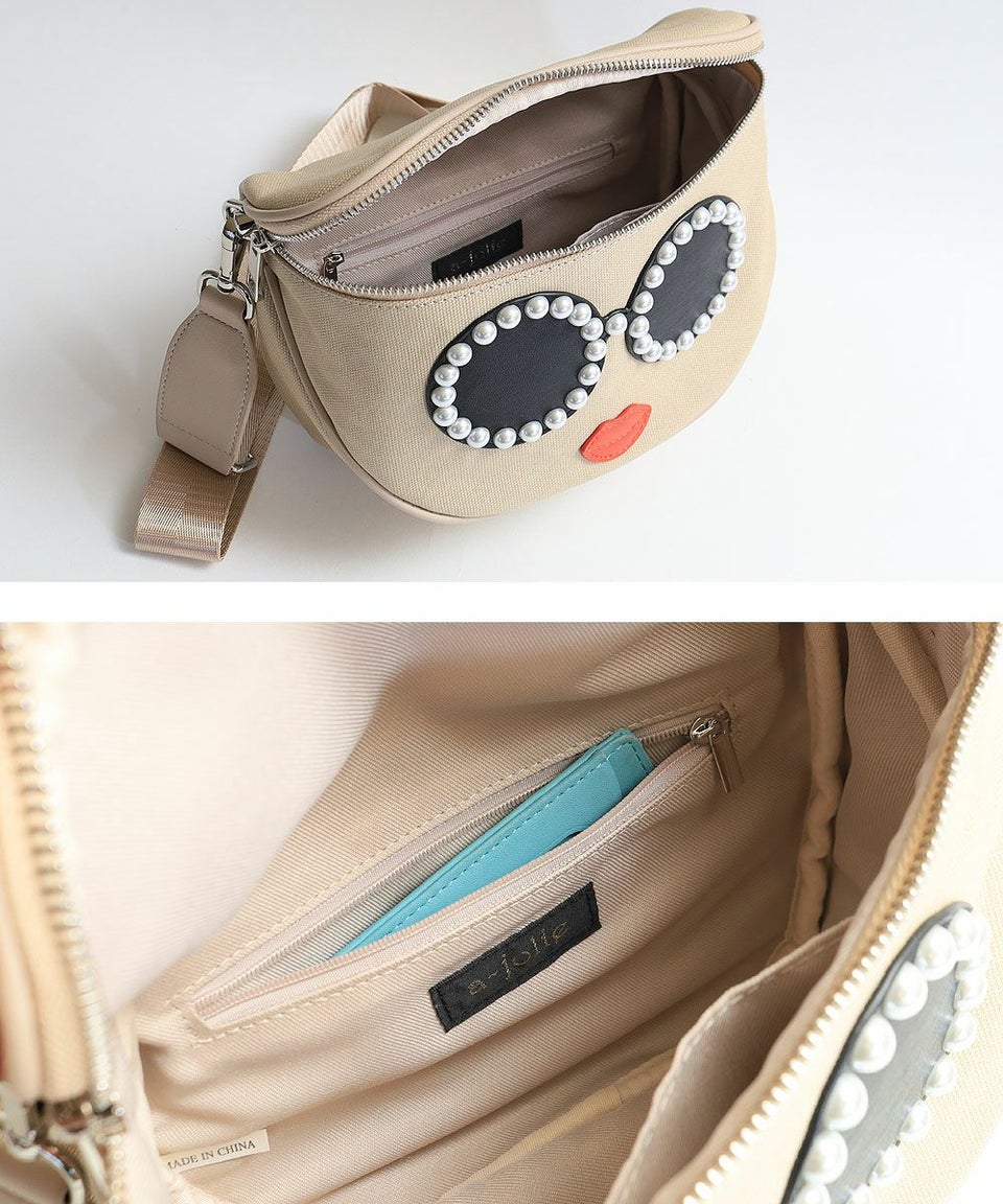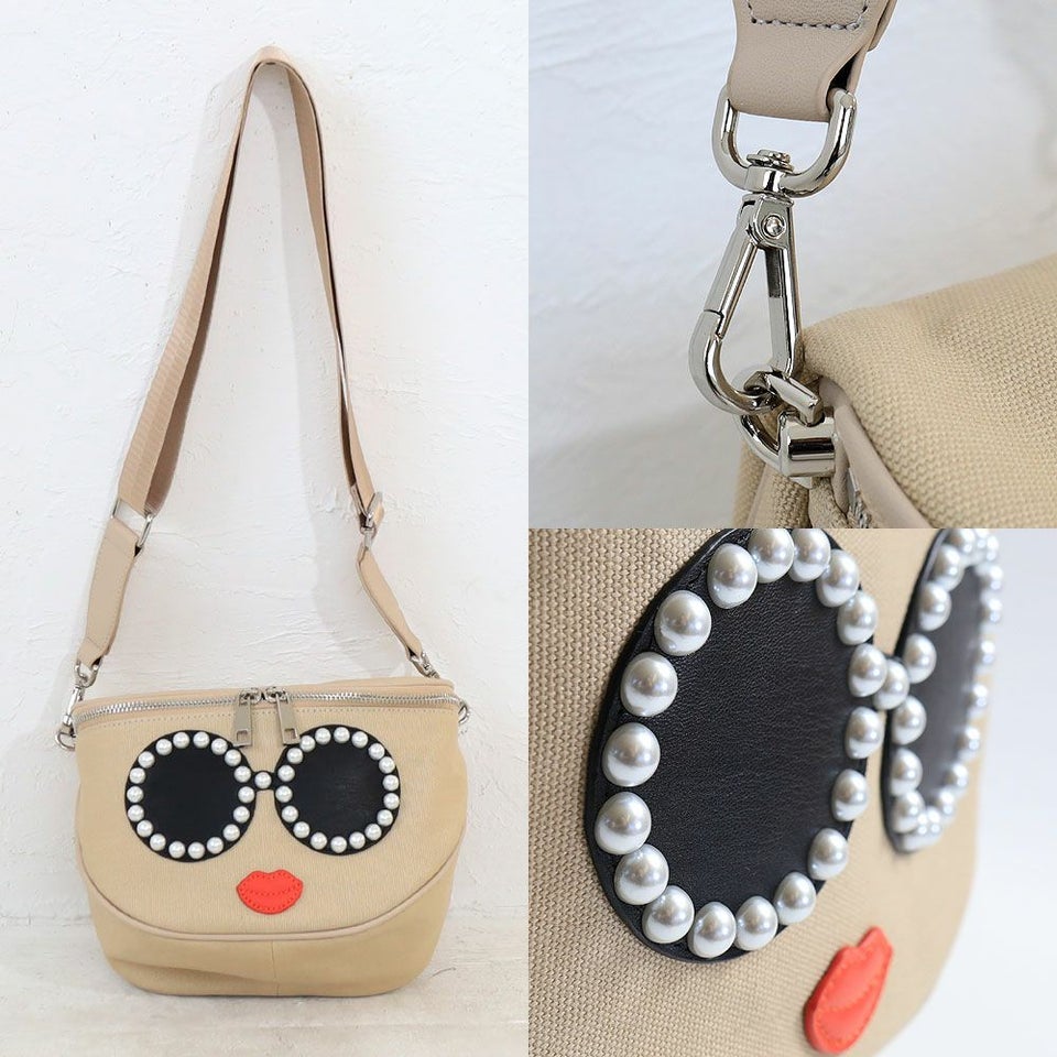 さらりとしたキャンバスにパールで縁取ったサングラスがとってもキュートな顔のボディバッグです。