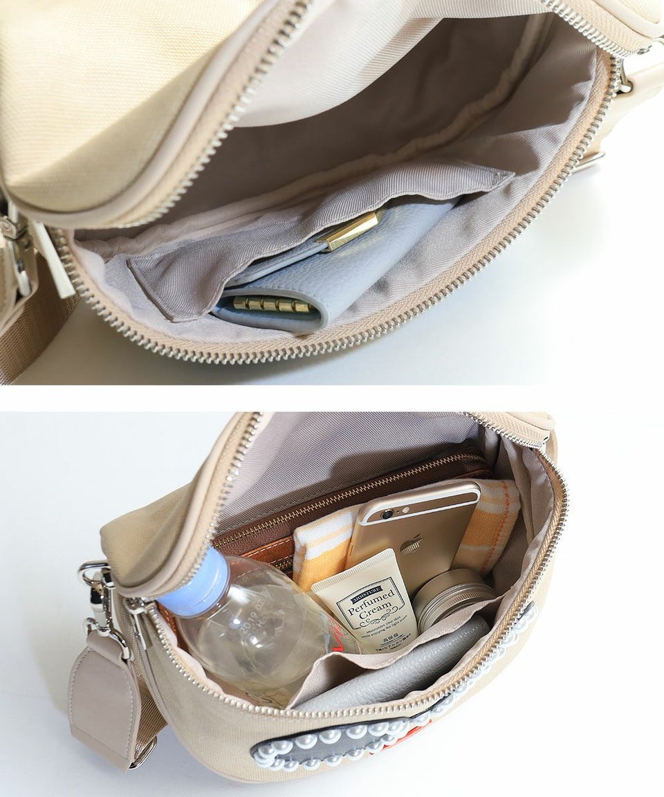 ファスナーで楽々開閉でき、中には長財布やペットボトルなど日常の手回り品は収納可能。