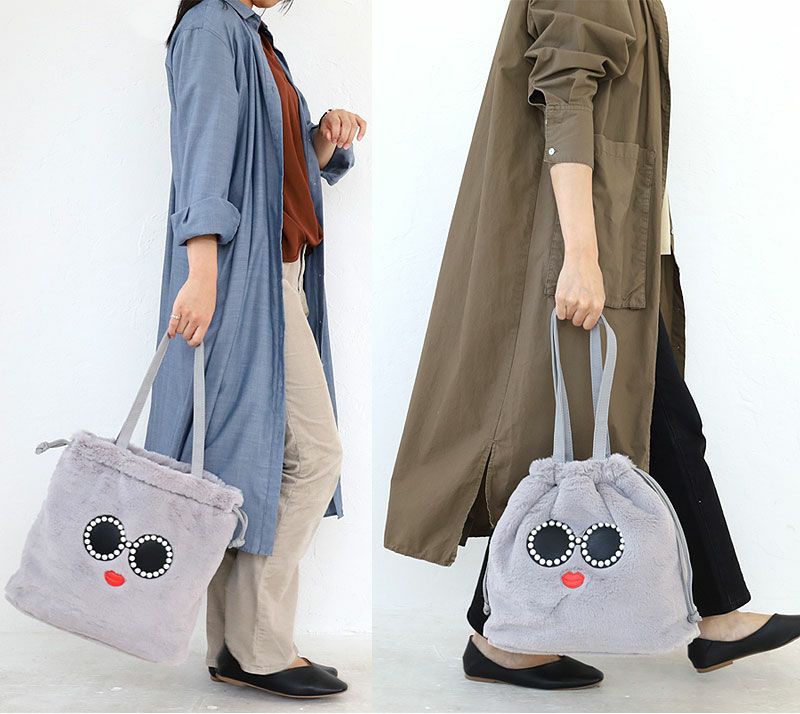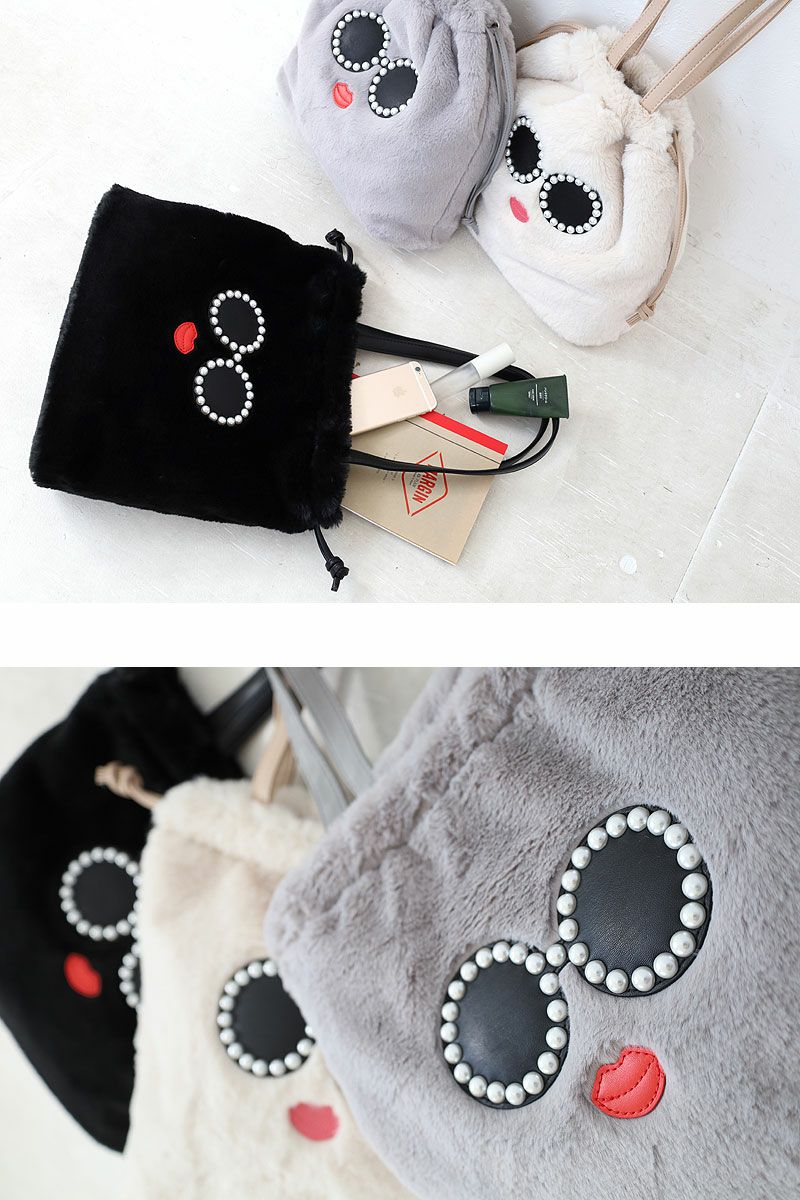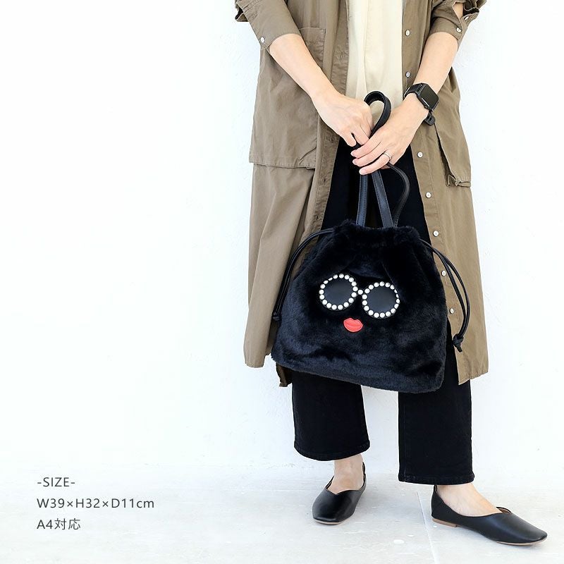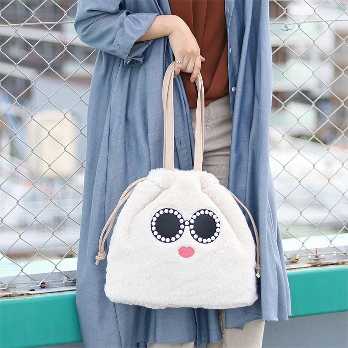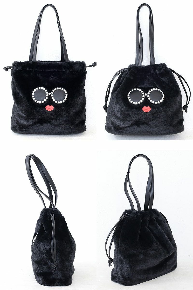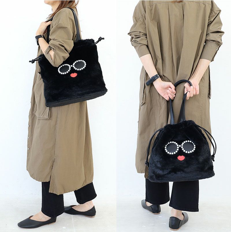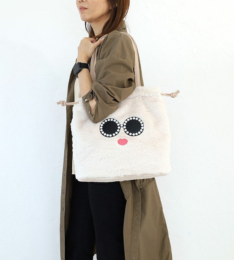もこもこのフェイクファーにパールで縁取ったサングラスがとってもキュートな顔のハンドバッグです。