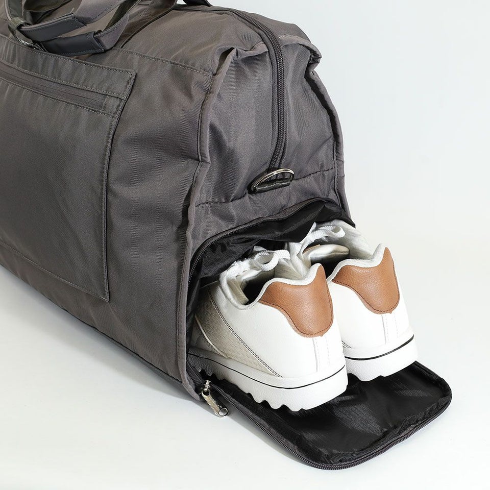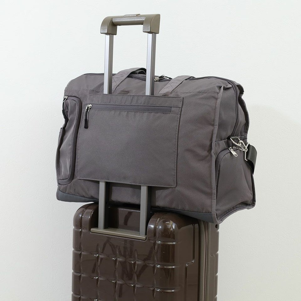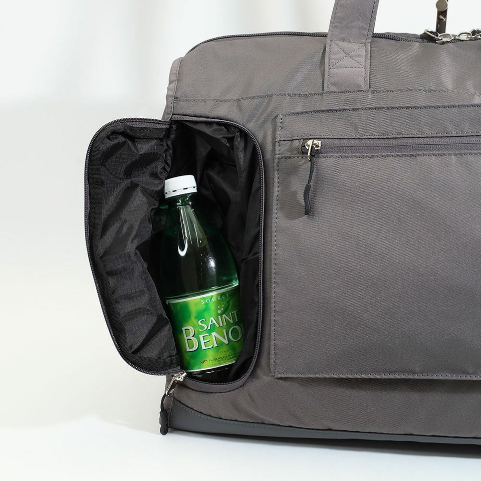 背面には、ボトルや折りたたみ傘などを収納できる縦長ポケットを配置。必要なときにサッと取り出せて、出し入れも快適。さらに、側面には独立したシューズポケットを備えているので、靴や汚れ物を分けて収納でき、衛生面でも安心です。