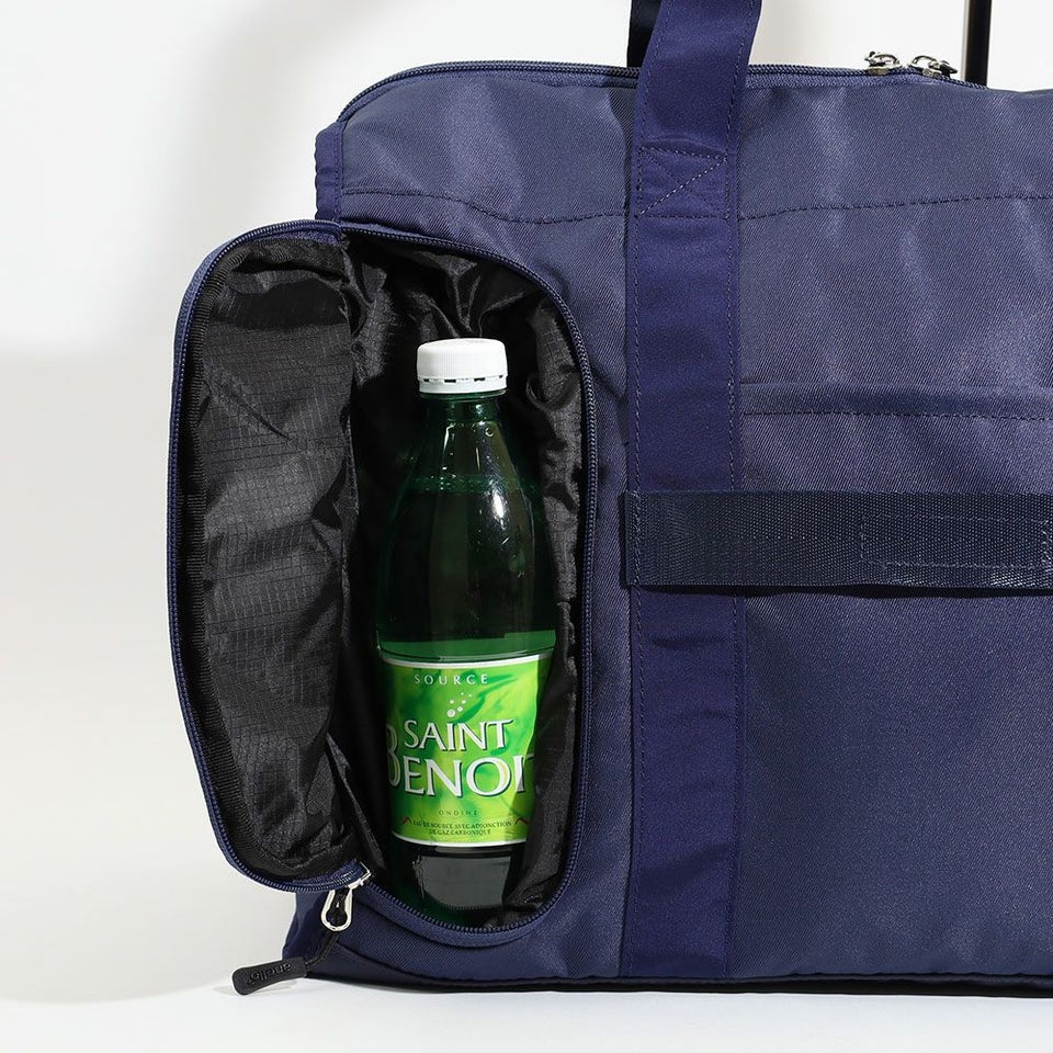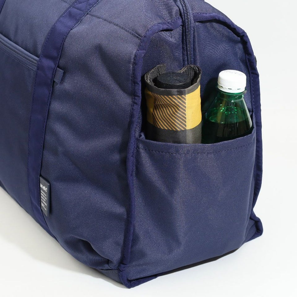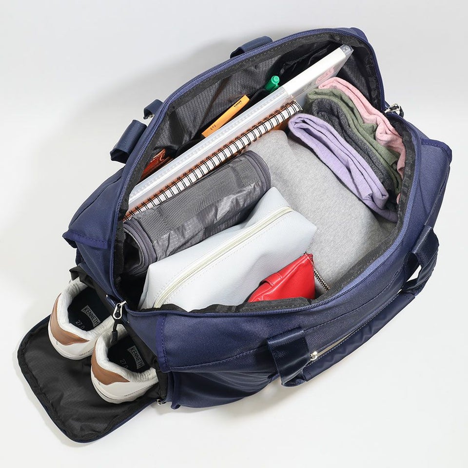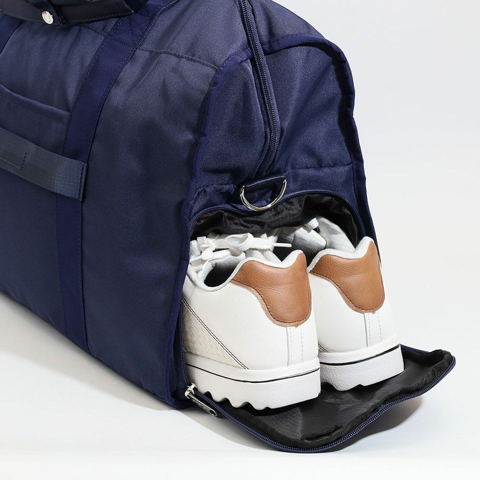 側面には、靴や汚れた衣類を分けて収納できる独立型のシューズポケットを配置。メイン収納と分かれているため、ほかの荷物を汚さず衛生的に持ち運べます。スポーツジムや旅行時に重宝する機能です。